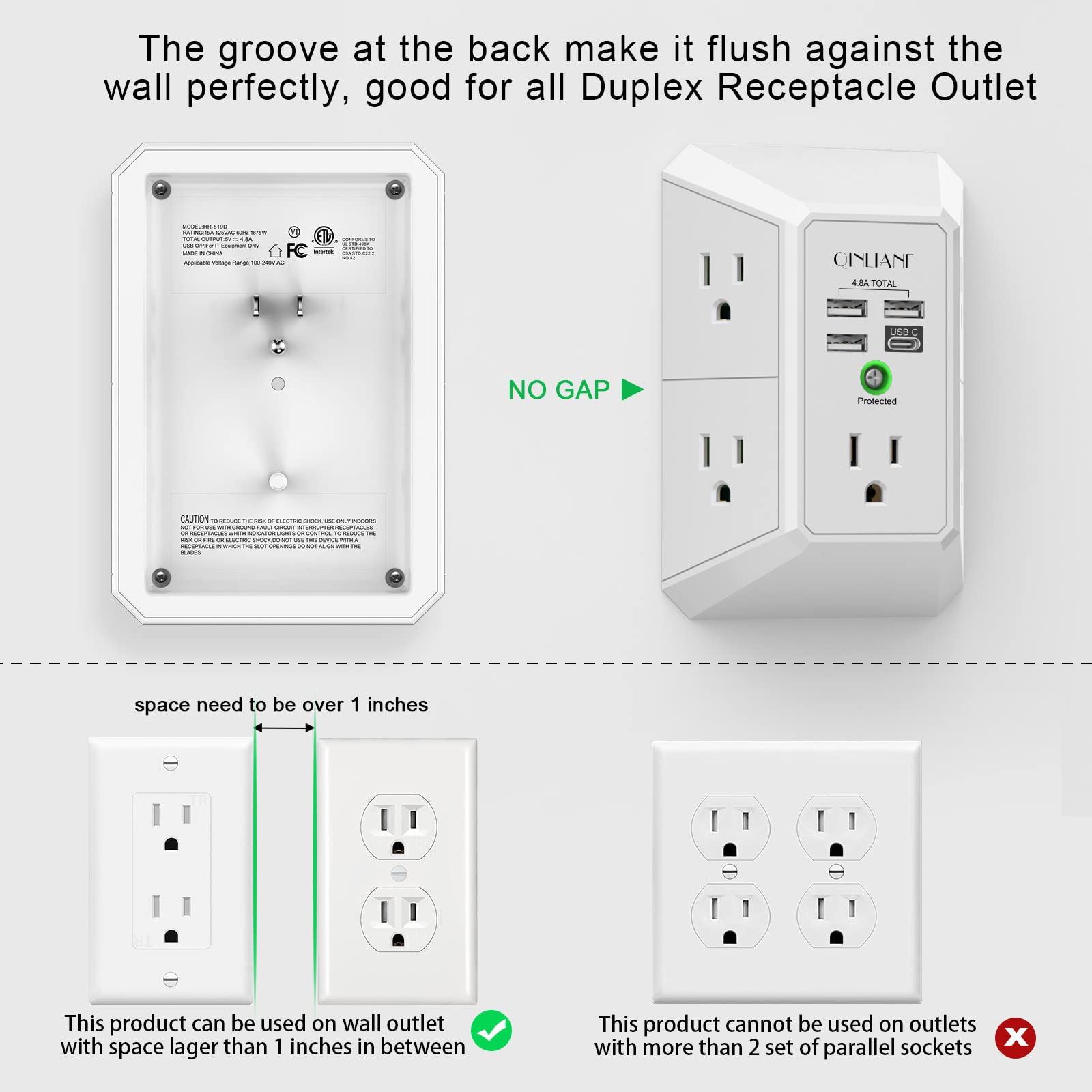 • 【The Groove Design on The Back and Wide space 】- 5 AC outlets with 2.1 inches long space in between, larger than standard 1.5-inch socket. Larger spacing makes it easier to use for all kinds of equipment. The groove at the back make it flush against the wall perfectly, good for all Duplex Receptacle Outlet. NOTE: This product can be used on wall outlet with space lager than 1 inches in between ,This product cannot be used on outlets with more than 2 set of parallel sockets.