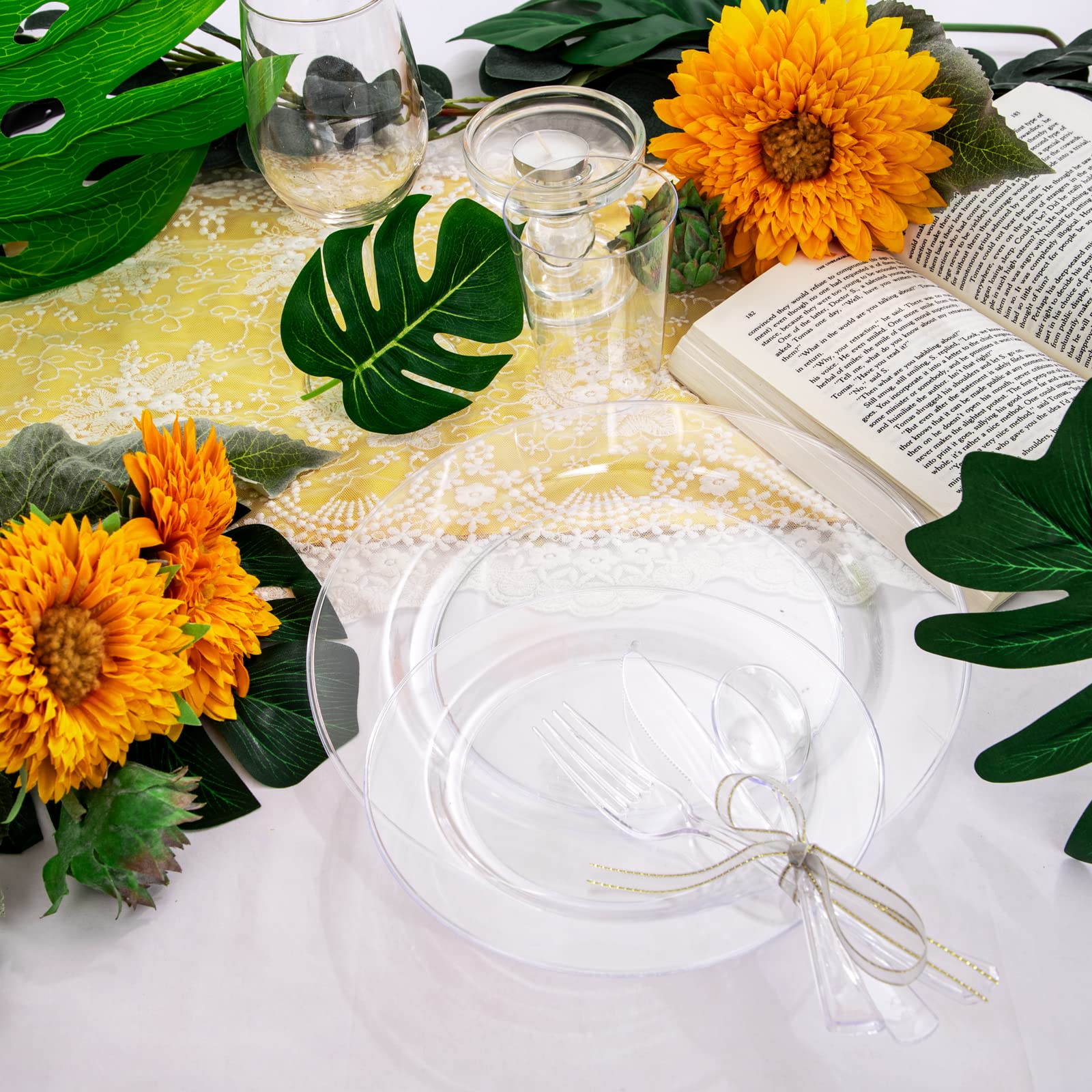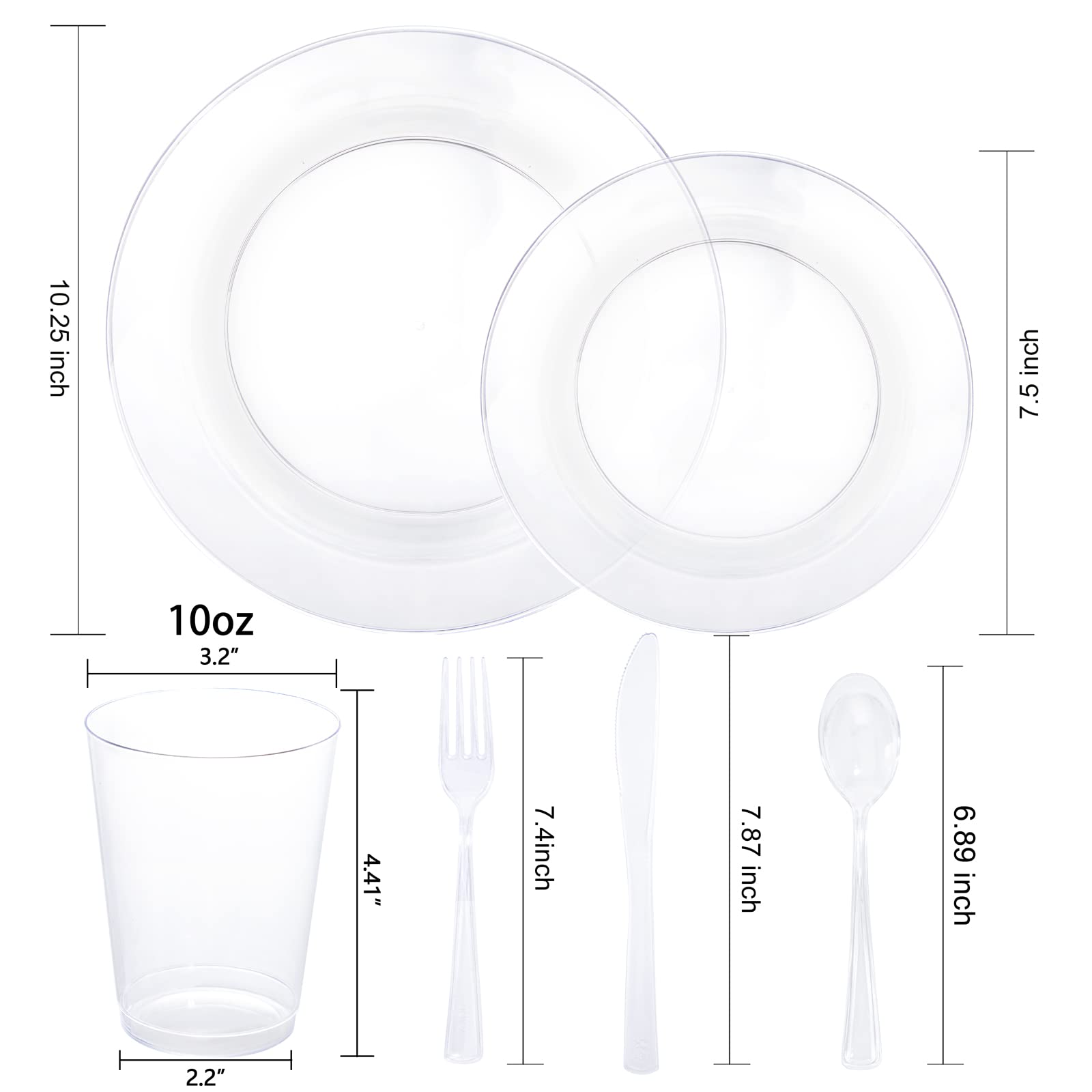 • FULL DINNERWARE SUPPLY SET: WDF clear dinnerware set includes 25 clear dinner plates, 25clear salad plates, 25clear forks, 25clear knives, 25clear spoons& 25pcs 10oz clear plastic cups. Idea for 25 guests, sturdy construction resists breakage, bending, and snapping.