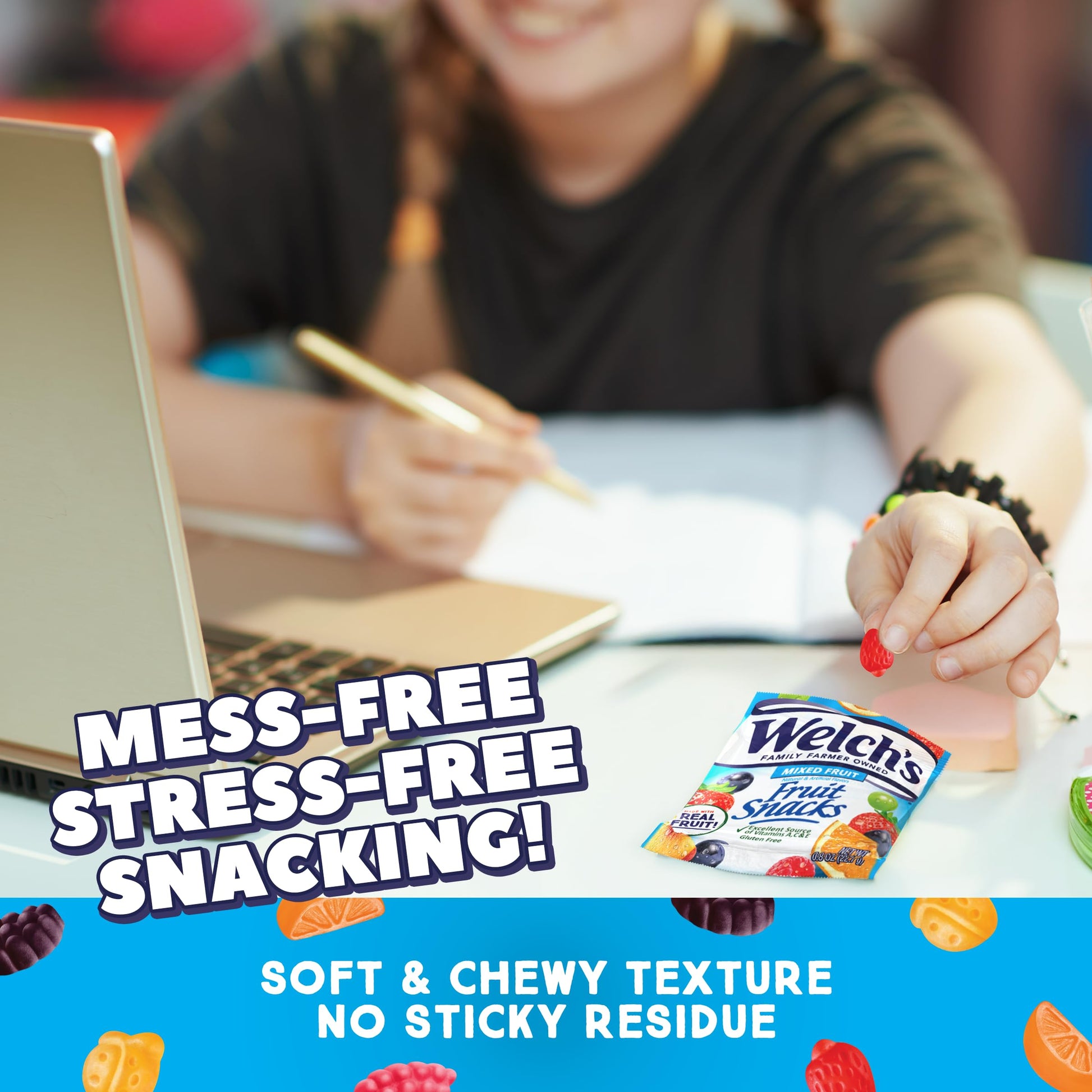 GLUTEN FREE SNACK PACKED WITH VITAMINS - Welch’s Fruit Snacks deliver 25% of your daily value of Vitamin C, A & E. They’re also a Gluten Free Snack and Fat Free.