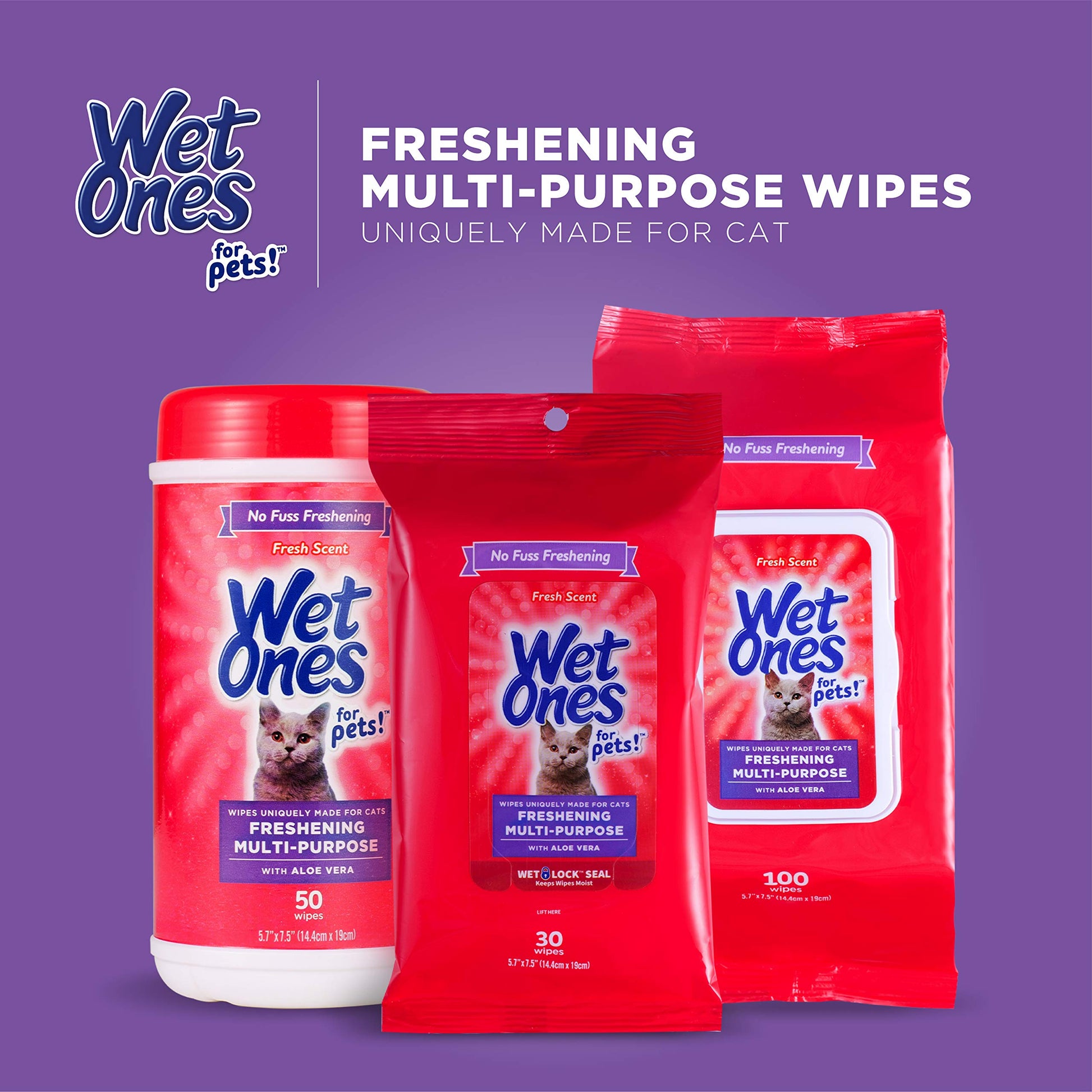 Details: Wet Ones for Pets Freshening Multi-Purpose Wipes for Cats are designed with your pet in mind for a quick, gentle, & healthy clean anytime, anywhere! These cat wipes for bathing are the perfect solution for a quick and easy refresh for your furry friend without the fuss of a traditional bath. Cat bath wipes from Wet Ones are formulated with soothing aloe vera to help moisturize your cat's skin and leave behind a soft and healthy, glowing coat. Cat grooming wipes from Wet Ones are infused with a light fresh scent fragrance to ensure your cat always smells fresh and clean! Directions: 1. Remove wipe from canister and reseal to maintain freshness. 2. Wipe down cat from back of neck to tail, carefully avoiding the eyes. 3. Dispose of wipe in trash, do not flush. 4. Play on! Inactive Ingredients: Water, Aloe Barbadensis Leaf Juice, PEG-75 Lanolin, Quaternium-52, PEG-8 Dimethicone, Fragrance,Disodium Cocoamphodiacetate, Disodium EDTA, Chamomilla Recutita (Matricaria) Flower Extract,Potassium Sorbate, Phenoxyethanol, Cetylpyridinium Chloride, Sodium Benzoate, Citric Acid. WARNINGS: For external use only. Safe for cats 8 weeks of age and older. Avoid contact with eyes. Keep out of reach of children. Distributed by Fetch for Pets New York, NY 10018 USA Made in China WET ONES is a trademark of Edgewell Personal Care Brands, LLC and is used under license. 2020 Edgewell. YOUR SATISFACTION IS OUR PRIORITY: If you have any questions or feedback, please reach out to us at Fetch for Pets.