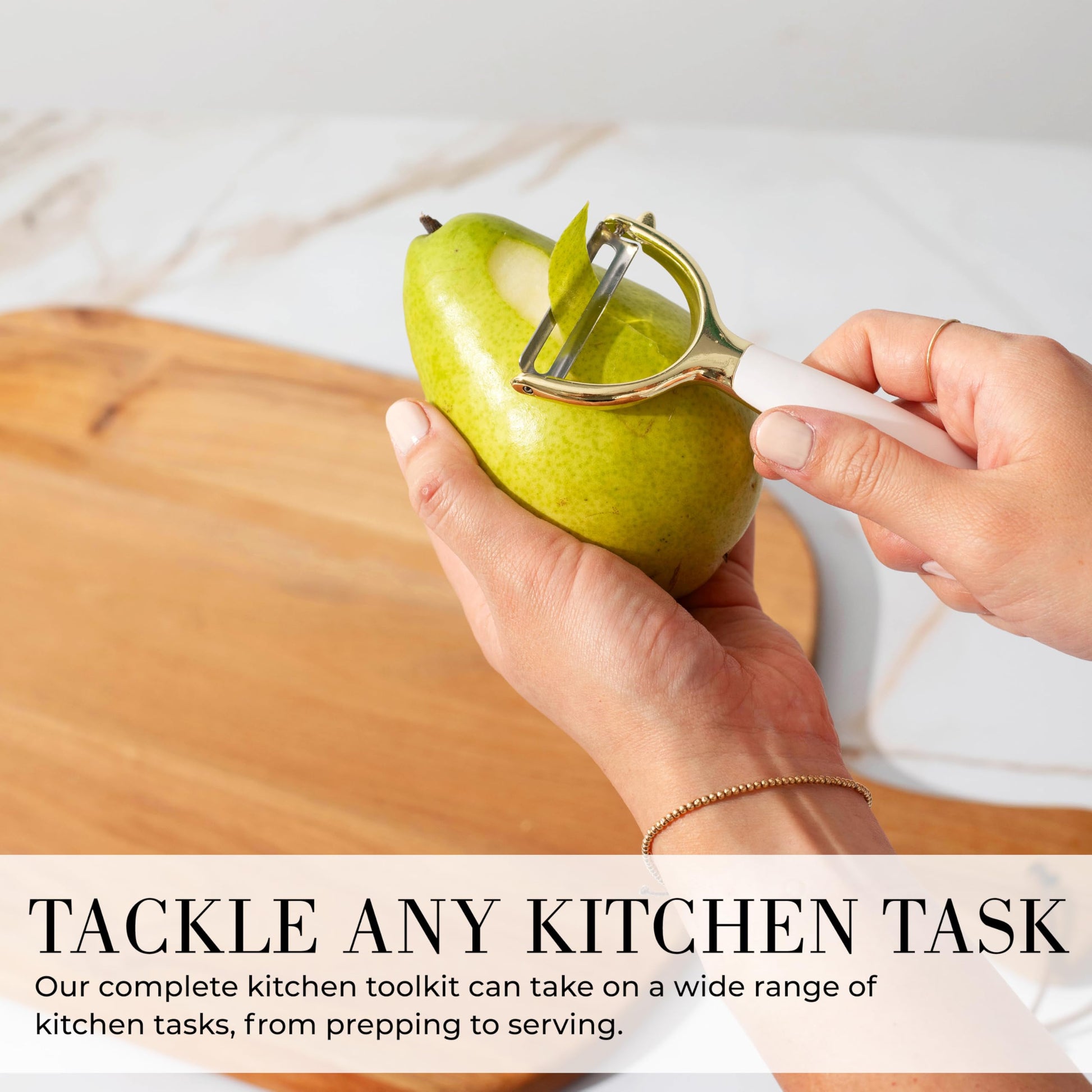 • ✔ THOUGHTFULLY DESIGNED AND ELEVATED GOLD KITCHEN TOOLS AND GADGETS — features of our unique gold and white kitchen accessories include white mini tongs for cooking with silicone tips, white garlic press with large chamber for easy cleaning, soft grip white can opener with large knob for ease of use,white pizza cutter wheel with built-in finger guard,white whisk and cheese grater with loop handle for storage and white vegetable peeler with built-in potato eye remover and wide swivel blade