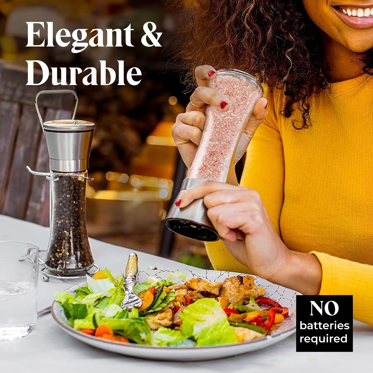 Willow & Everett Salt & Pepper Grinder Set with Stand - Stainless Steel Manual Mills & Holder with Adjustable Coarseness, Refillable Design for Peppercorns & Rock Salt Sold Separately
