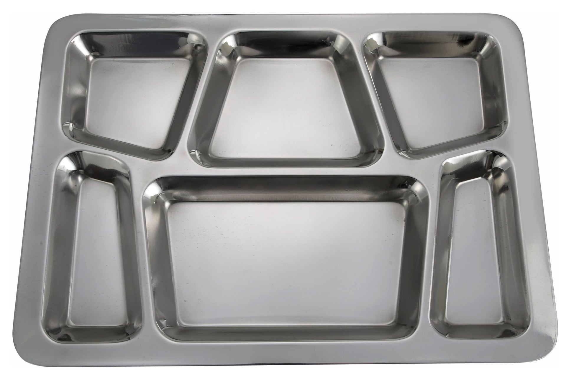 Details: Mess Tray, 6 compartment, Style B. Commercial grade quality stainless steel. 6-Comparment food slots. Multi-purpose food tray for any cafeteria setting. Dishwasher Safe. DIMENSION: Length - 153/4 Inches, Width - 113/4 Inches, Depth - 3/4 Inches.