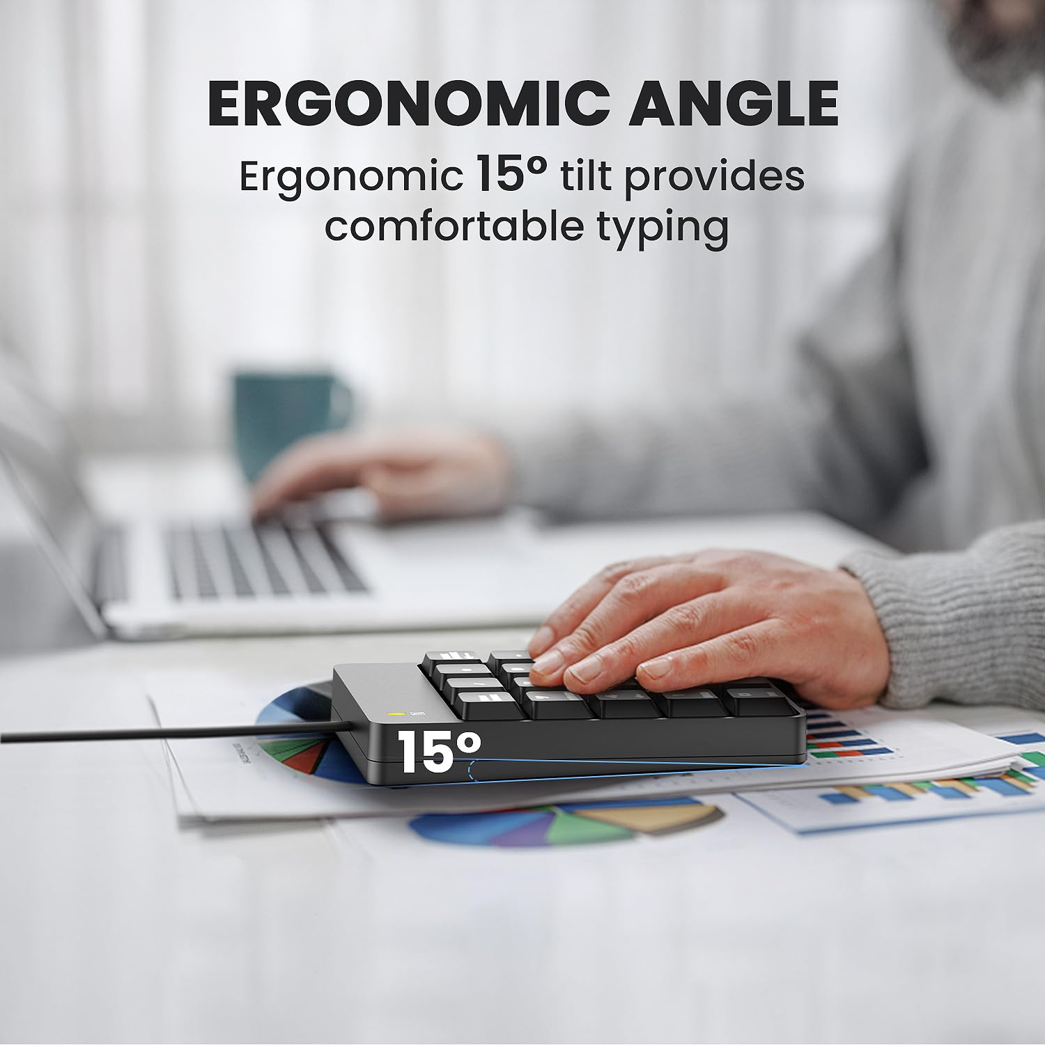 • Quiet & Soft Touch - Integrated ergonomic tilt provides comfortable typing, helps reduce the wrist strain. Low noise of the 19-key USB numeric keypad gives you a quiet and soft touch.