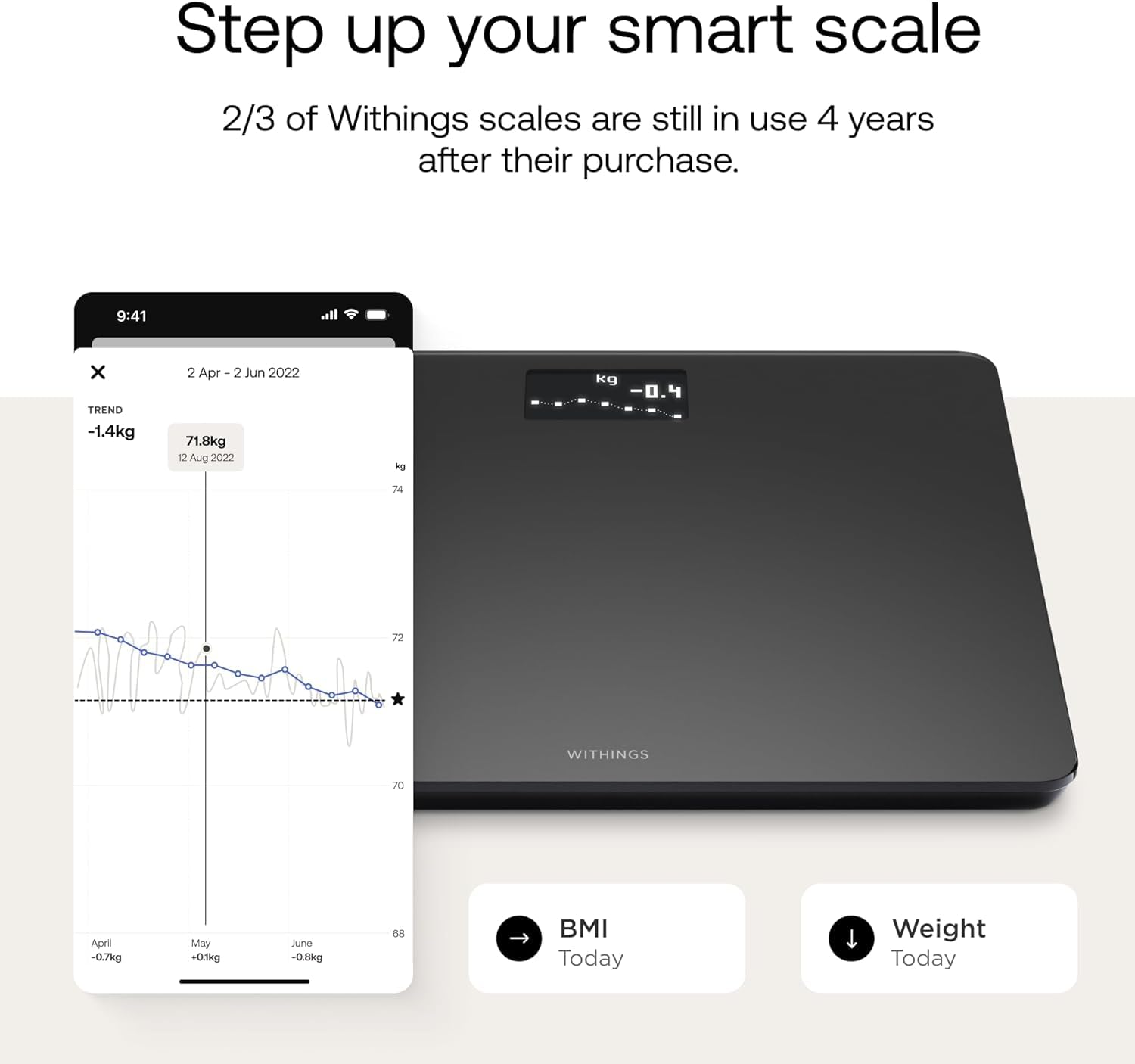 • AUTOMATIC DATA SYNC - Data from every weigh-in appears automatically via Wi-Fi or Bluetooth in the Health Mate app.