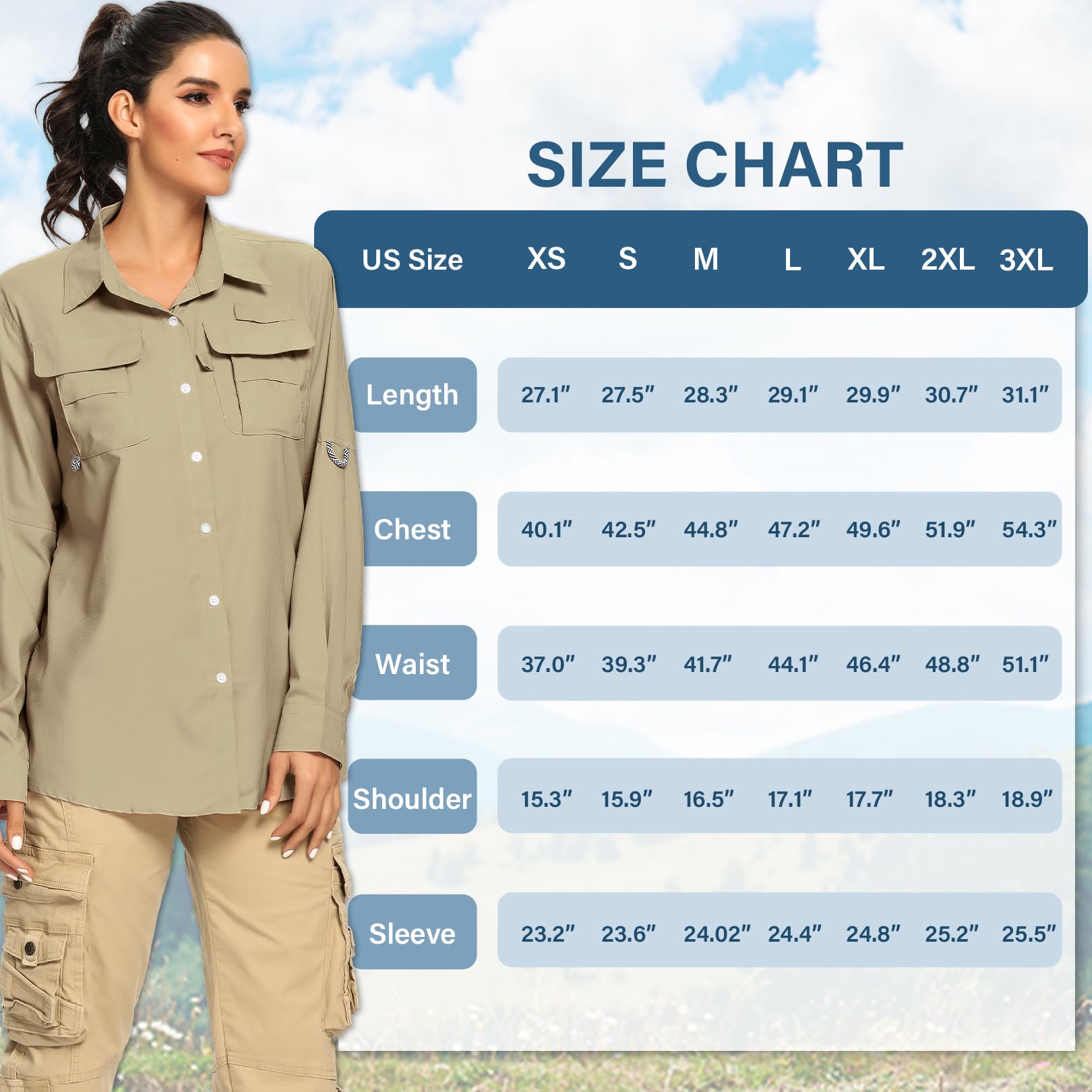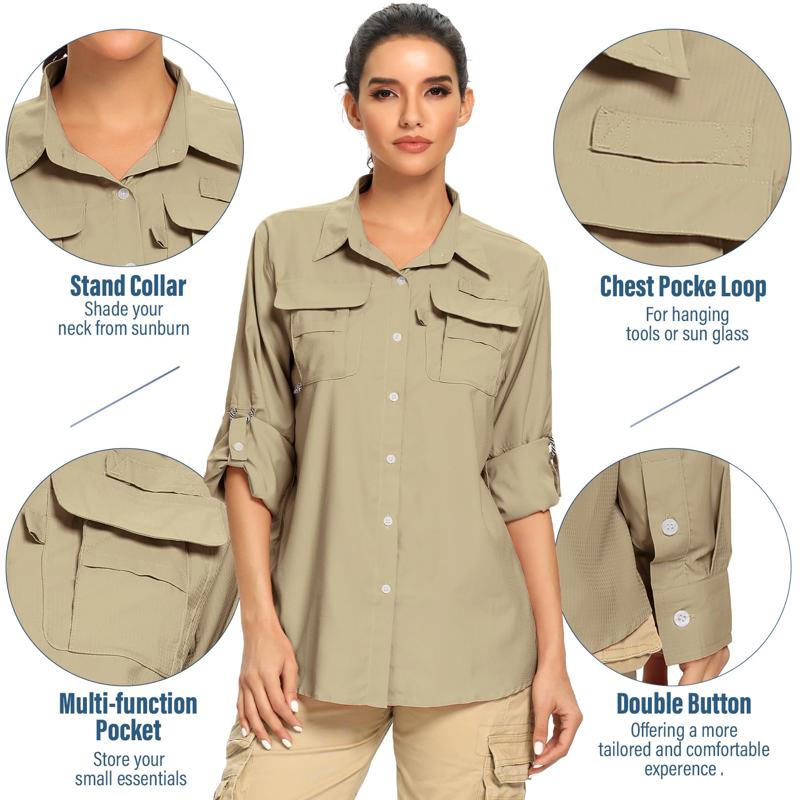 • Long Sleeve Shirt Women: 100% Nylon, this quick dry shirts women make ultimate breathability and comfort,and keep you cool and dry on safari or daily wear.