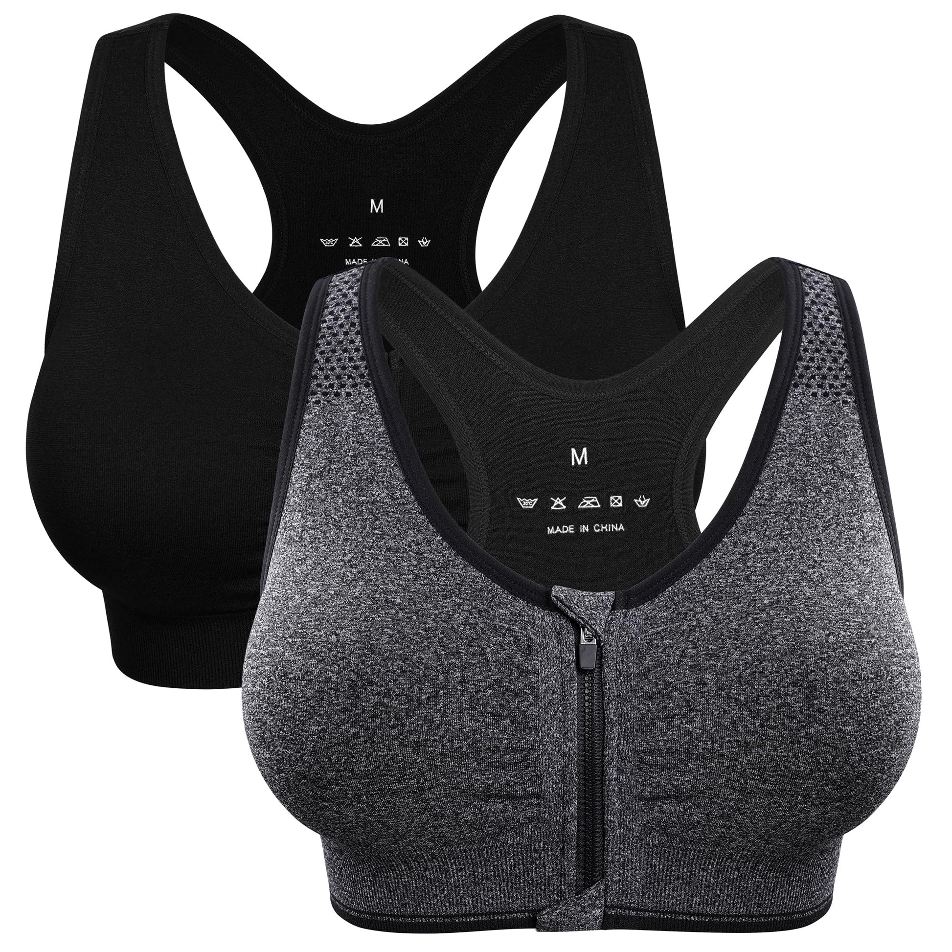 Women's Zip Front Sports Bra - Wireless, Padded, Post-Surgery, Racerback, Workout & Yoga Bra Top 2 Pack