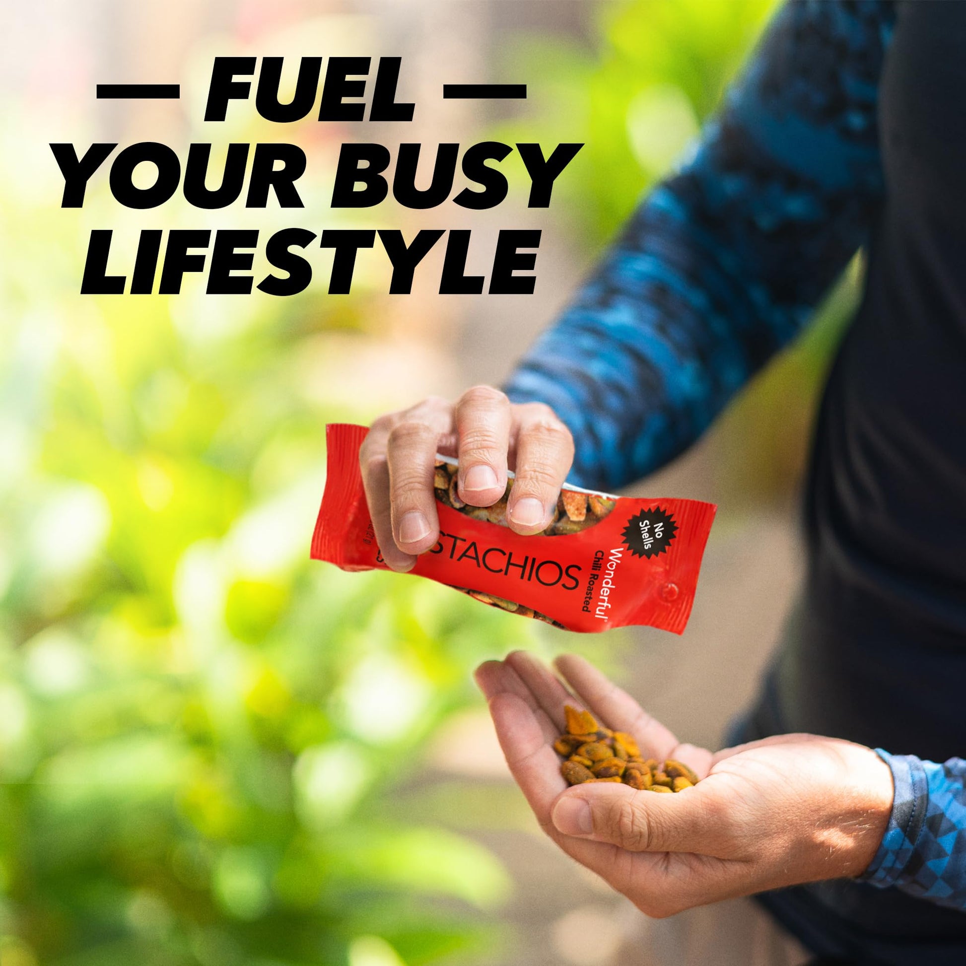 Details: One box of nine (9) 0.75 Ounce Bags of our No Shells Wonderful Pistachios Whether you’re craving something sweet, spicy, or savory, Wonderful Pistachios No Shells has a flavor for everyone, with 9 bags of protein-powered, grab-and-go goodness. Get Snackin’! Each Box includes (4) 0.75 Ounce Bags of Roasted and Salted, No Shells Wonderful Pistachios, (3) 0.75 Ounce Bags of Chili Roasted, No Shells Wonderful Pistachios, and (2) 0.75 Ounce Bags of Honey Roasted, No Shells Wonderful Pistachios. Roasted and Salted Wonderful Pistachios have literally come out of their shells. Same delicious taste, but with a little less work for you. Still great for snacking, they’re also a wonderful addition to your culinary creations. Wonderful Pistachios are a smart, healthy choice for folks around the world. Wonderful Pistachios grows all of its pistachios in California’s fertile San Joaquin Valley. The warm days and cool nights work in harmony with the region’s natural soils to create the perfect growing climate. We then carefully tend and harvest each pistachio using the latest in sustainable practices. Nutritious and healthy pistachios are great as part of an overall healthy diet. Pistachios are also a good source of plant protein. And in addition to tasting great, a single serving includes about 49 pistachios, enough to satisfy your snacking needs. Note: Contains Tree Nuts (pistachios).