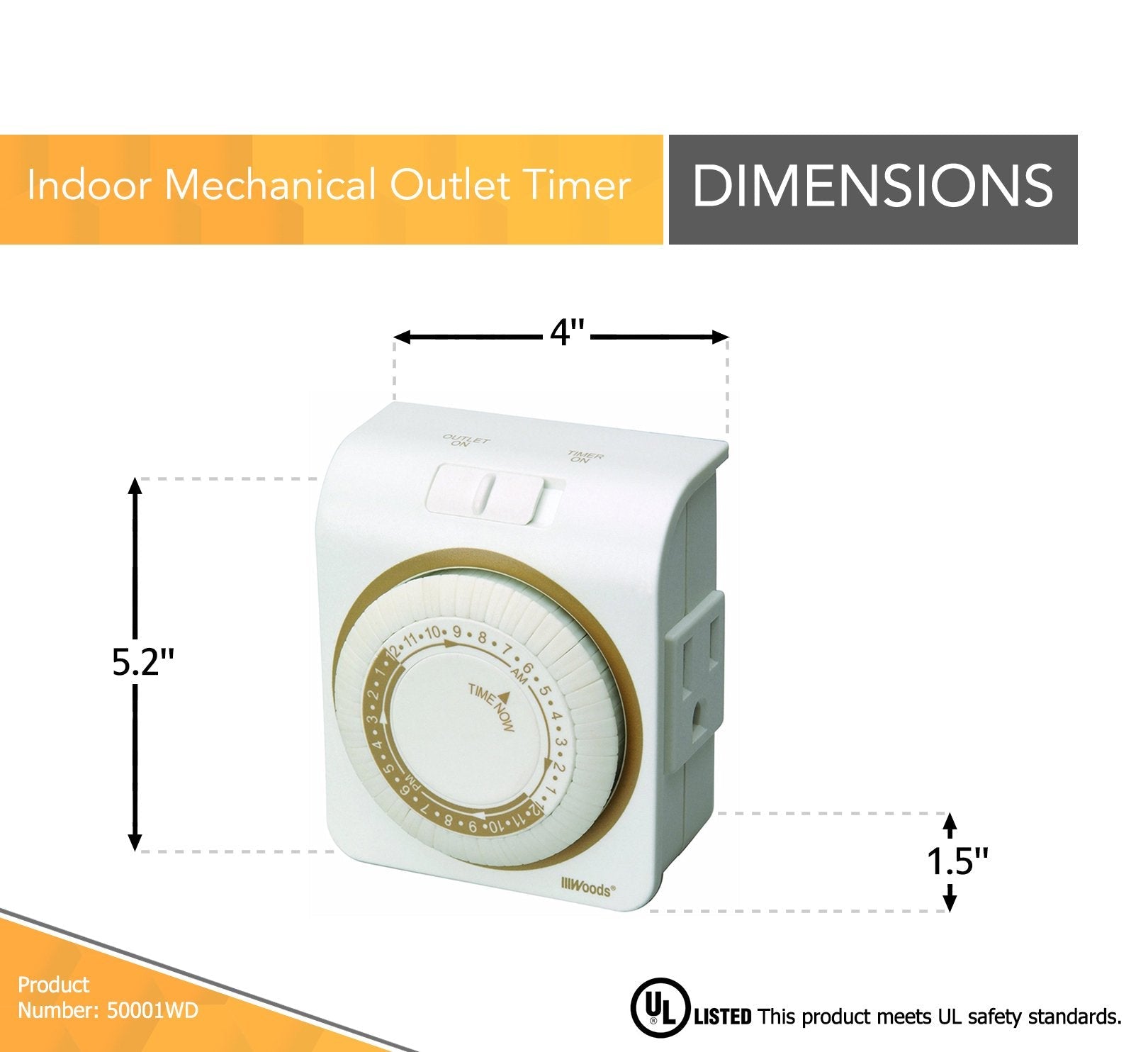 Details: Life should be simple; not complicated. The Woods 50001WD Indoor Mechanical Outlet Timer makes life just a little bit simpler by helping you save time and money. The outlet timer is perfect for any 3-conductor appliances that needs to be switched on or off at regular intervals; such as holiday lights; indoor lamps; or fans. Are you going on vacation and worried about leaving your house empty for the weekend? Set the timer to turn a lamp on and off to simulate that someone’s home. The timer works will with both LED and fluorescent lights.