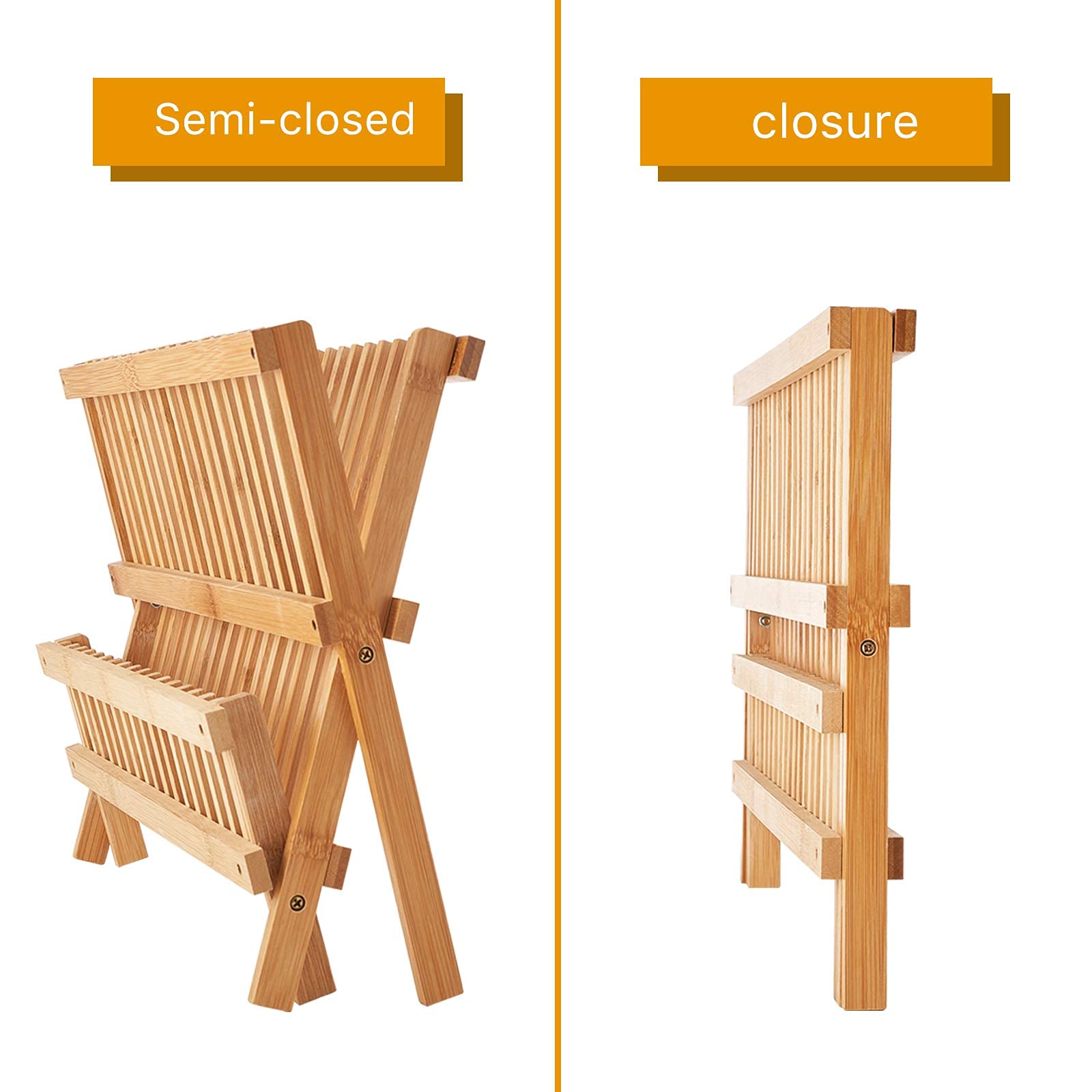 • [FOLDABLE DESIGN]--This folding bamboo drying rack features an X-shape design, occupying a small amount of space. The Plate holder can be stored in a corner or a kitchen Counter. You can easily set and tidy the bamboo dish rack up.