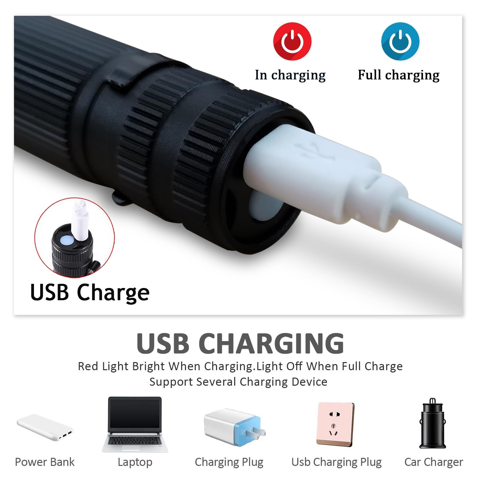 • USB Rechargeable: This tactical flashlight Built-in rechargeable battery , You can charge this flashlight directly via the included USB cable. A full-press to switch on and off and a half-press to cycle through lighting modes (a rapid off-on press also cycles lighting modes). Push-button tail switch for easy one-handed operation, feel more comfortable and safe