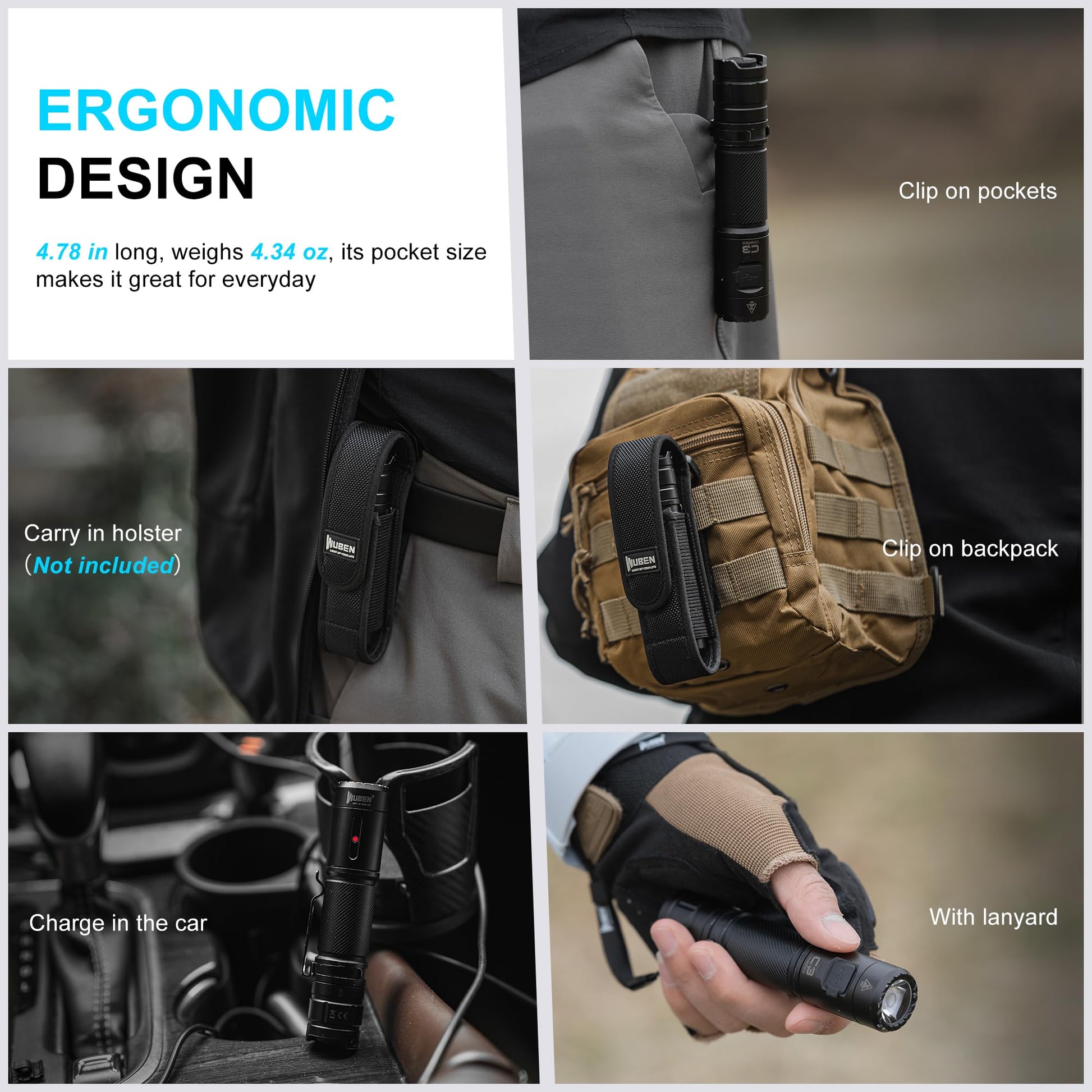 • Best for Everyday Carry: The pocket flashlight is 4.78 in long, weighs 4.34 oz, its pocket size makes it great for everyday carry. The pocket clip and lanyard of the flashlight make it very convenient to carry with you. And there is optional flashlight holster in our store, multiple ways for carrying to choose