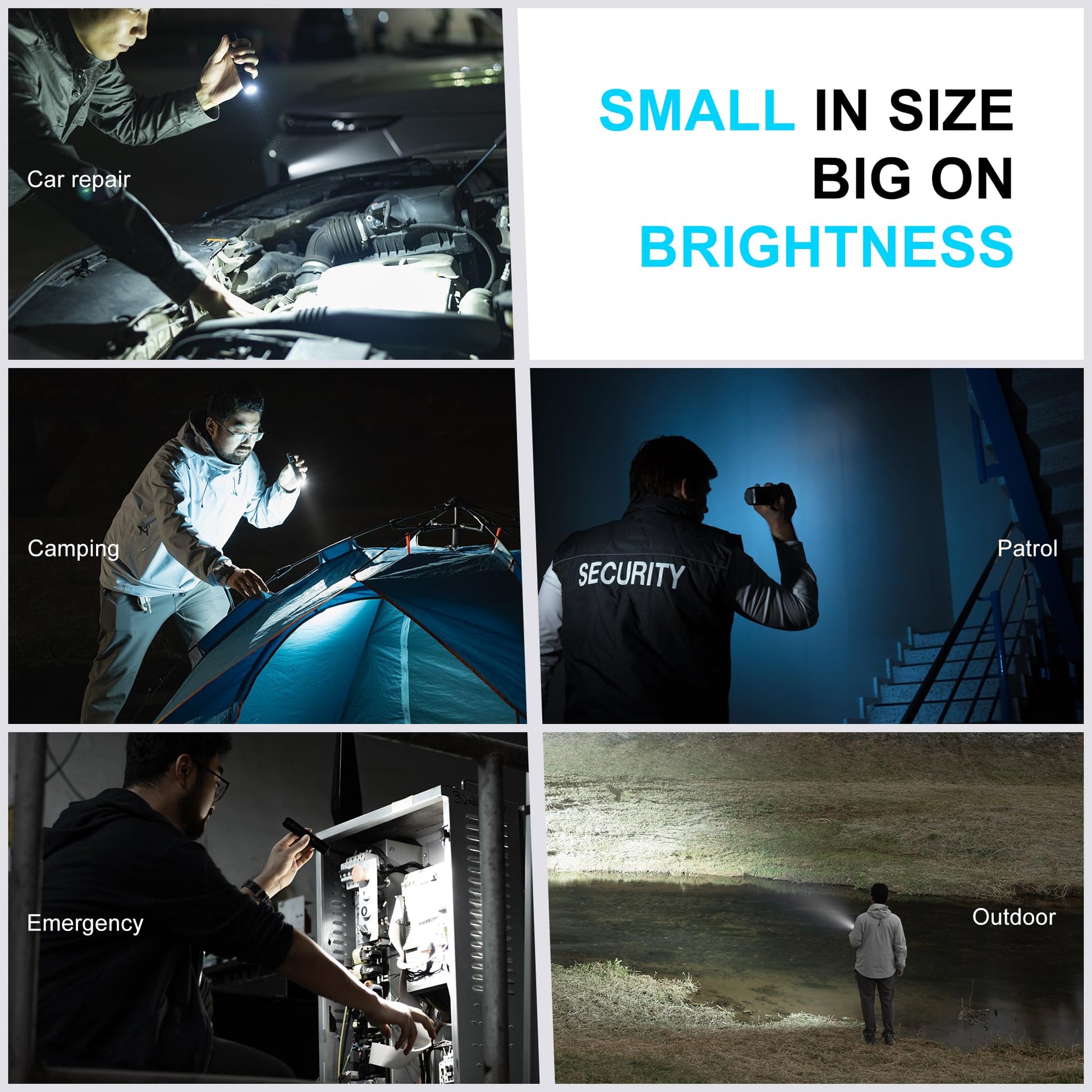 • Solid Build & Durable: The rechargeable flashlight body is made of hard anodizing aircraft grade 6063 aluminum alloy, its IP68 water resistance and 1.5 meters impact resistance make the flashlight endure rough handling and harsh weather