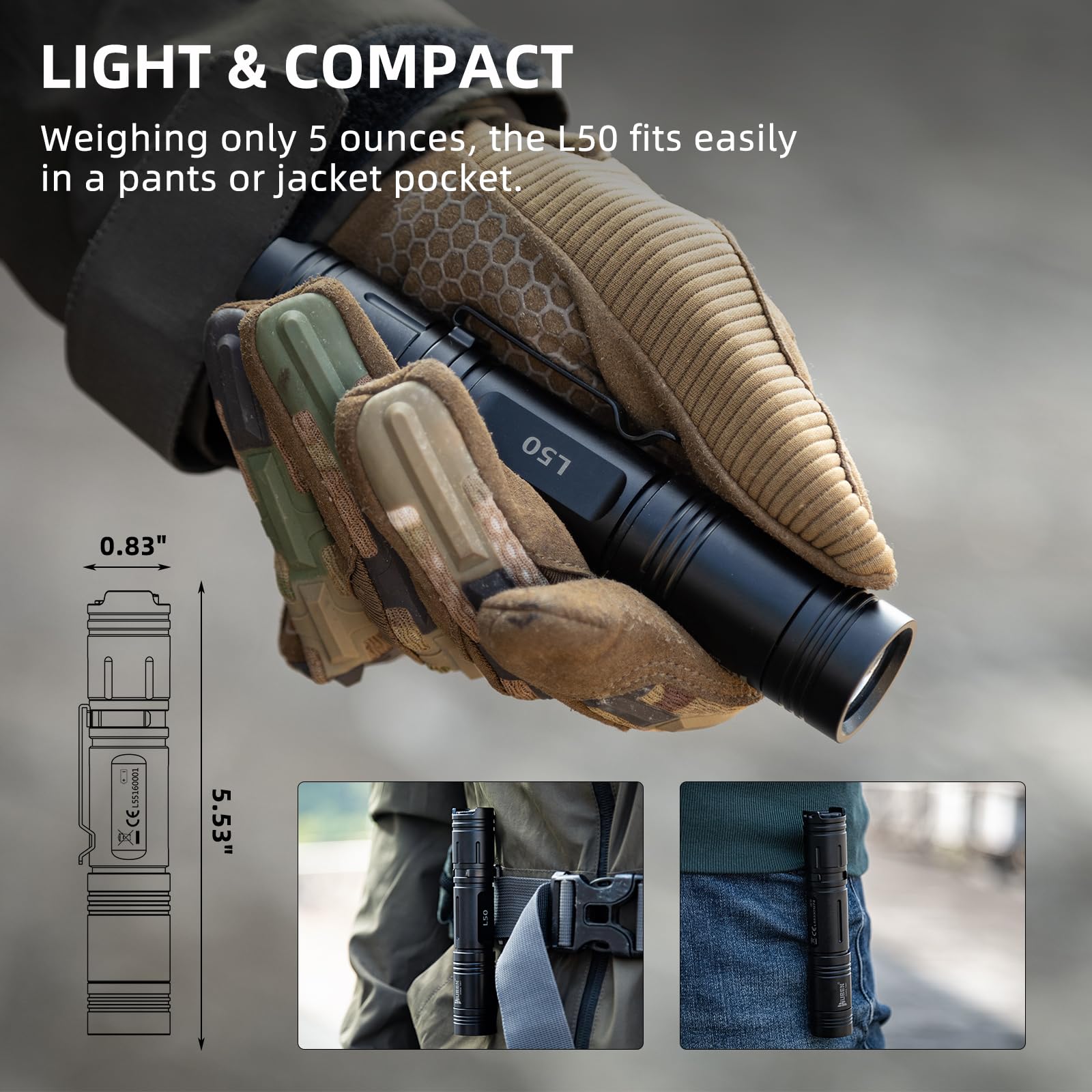 • Type-C Rechargeable: L50 rechargeable flashlights equipped with a USB-C charging cable and an upgraded 2600mAh battery. The flash lights fast charging port can make your flashlight fully charged in 3 hours