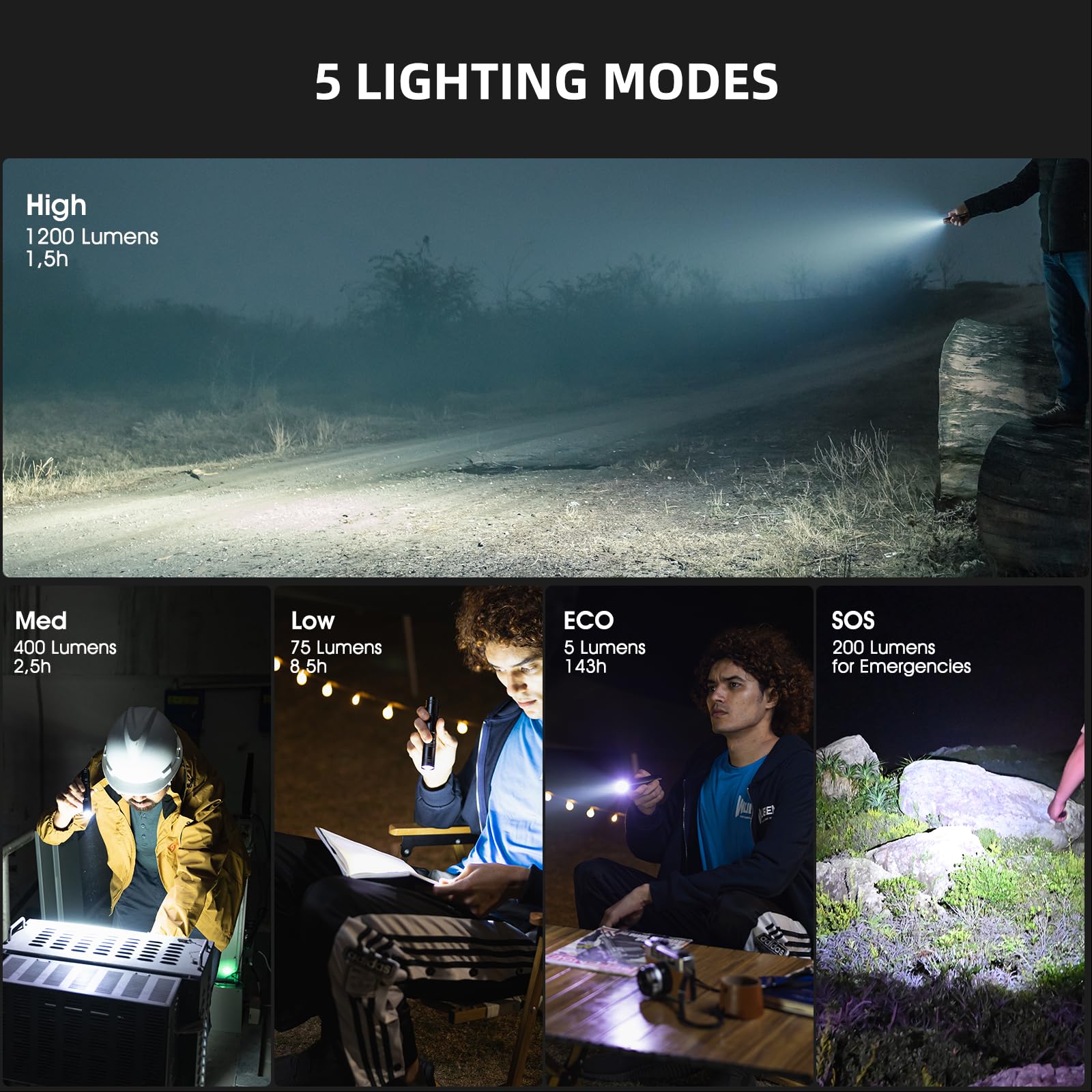 • 5 Light Modes: High(1200 LM) / Med(400 LM) / Low(75 LM) / Eco(5 LM) / SOS(With memory function)