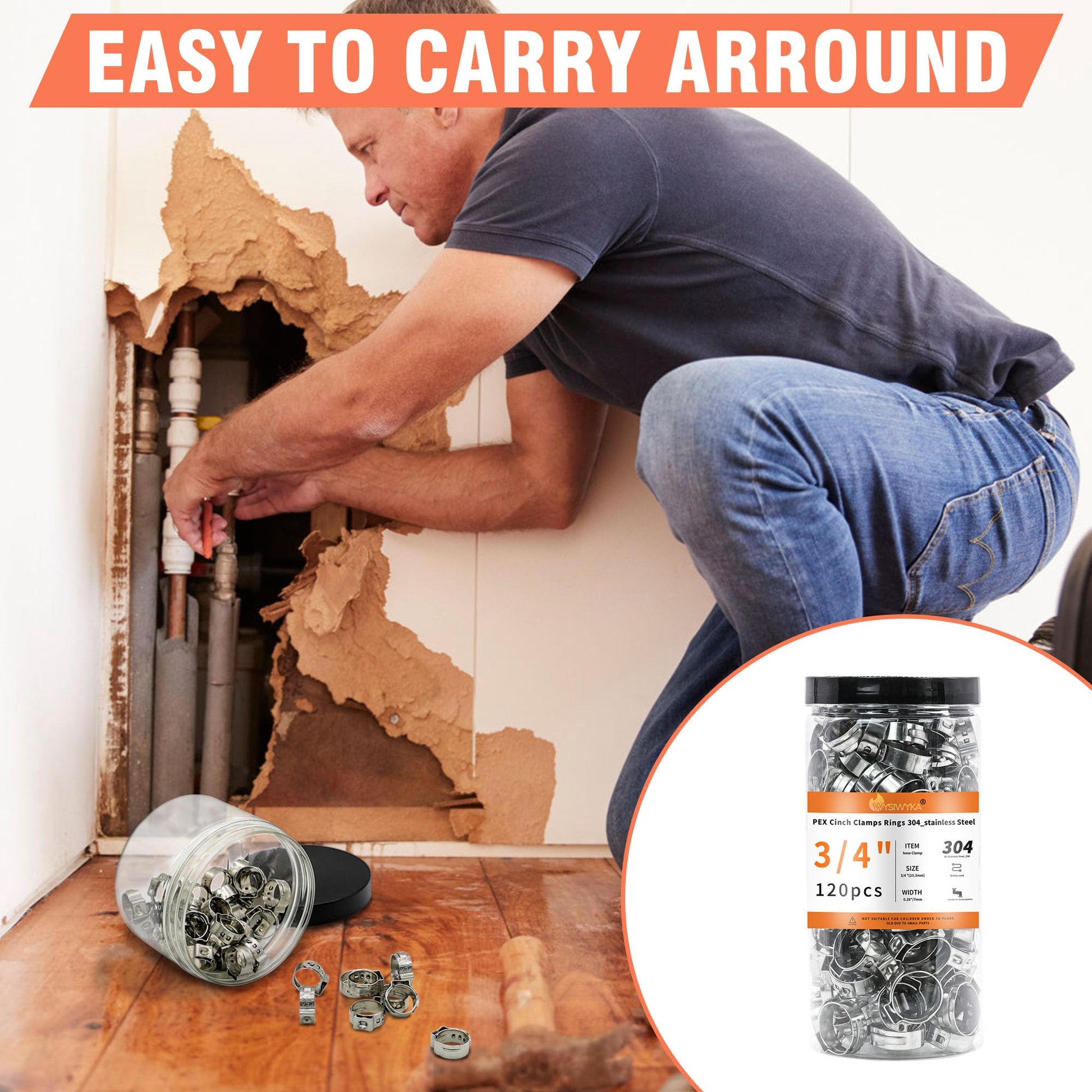WYSIWYKA 120pcs 3/4 inch PEX Cinch Clamps Rings, 304 Stainless Steel Single Ear Hose Clamps, Pex Crimp Rings for PEX Tubing Pipe Fitting Connections