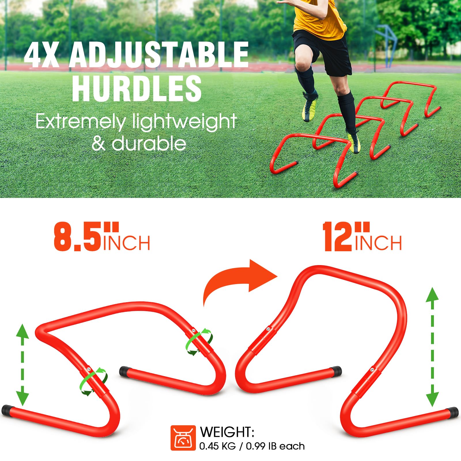 • 'Agility Training Equipment Kit': Includes 20-foot advanced agility ladder with fixable 4 stakes, 4 Agility hurdles,12 yellow disc Soccer Cones, Running Parachute. Whether you are a beginner or an expert, the agility training equipment can meet your training requirements.