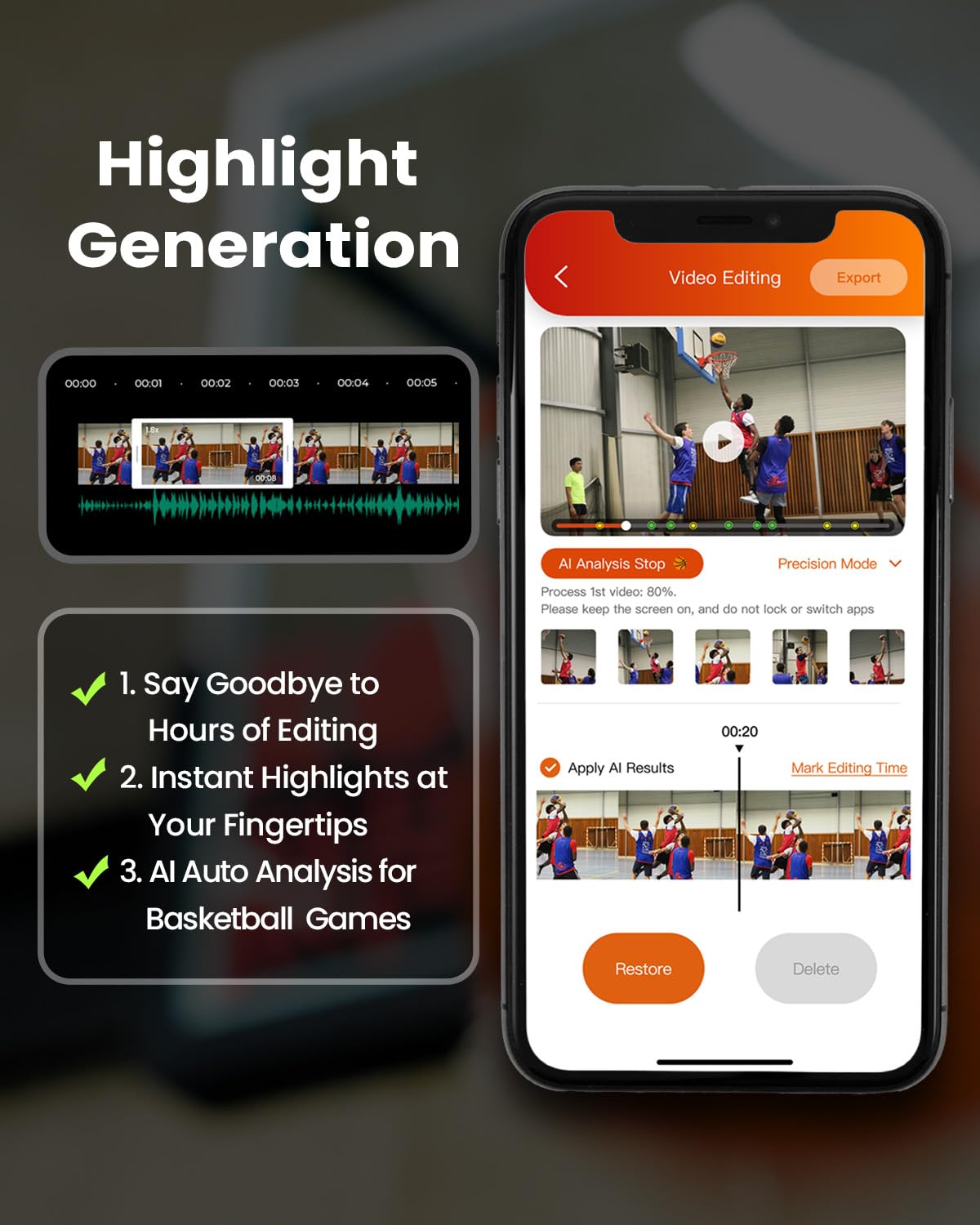 • AI-Assisted Auto-Editing and Live Streaming: Harness the power of AI to elevate your video editing experience. Effortlessly capture and edit breathtaking moments, create stunning montages, and seamlessly share your sports highlights with the world through integrated live streaming on popular platforms.