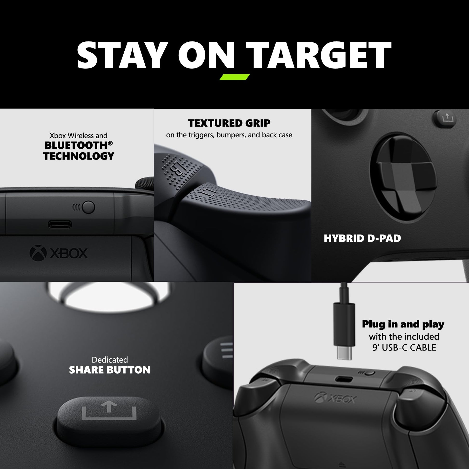 INCLUDES: Xbox Wireless Controller in Carbon Black + USB-C Cable. Play wirelessly or use the included 9’ USB-C cable for a wired gaming experience.