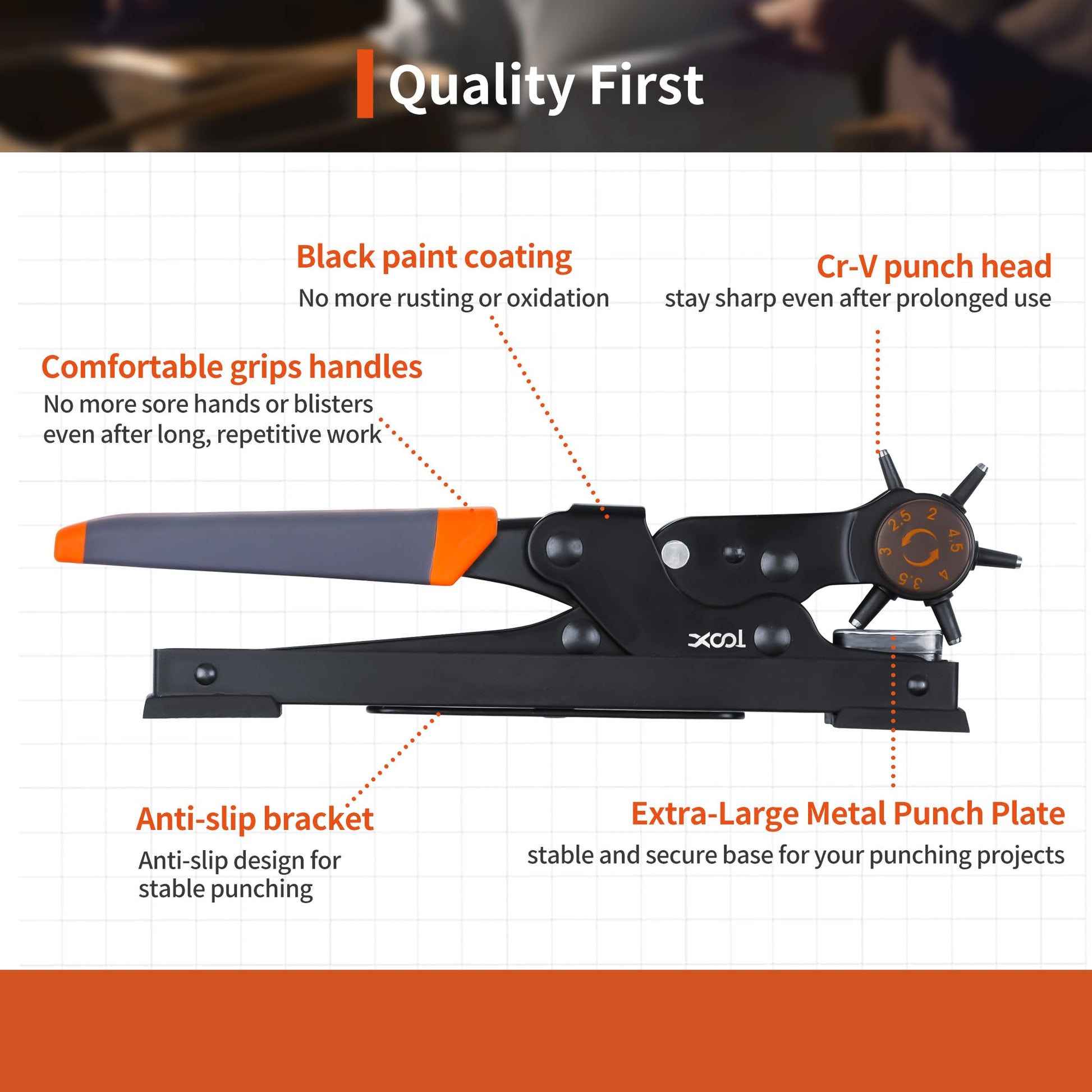 • 【High Quality and Safety】 The durable punch plier is made of plated steel that is high hardness, good toughness and durable. The surface of metal deal with spray lacquer process to avoid oxidation. The thickness of the punching plate is designed to ensure safety and make auxiliary punching easier.