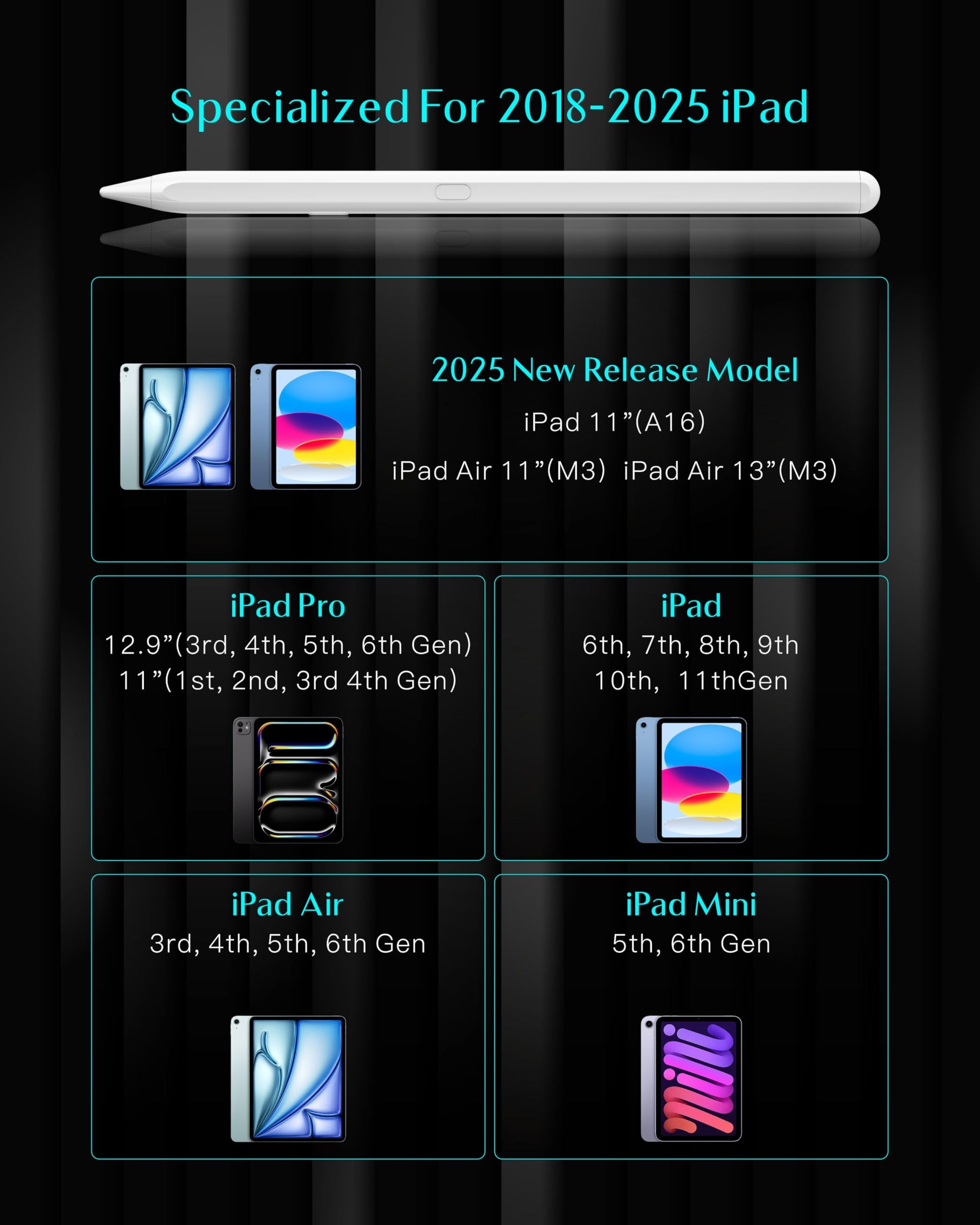 • 【Wide Compatibility – iPad Accessories for 2018-2025 Models】🔍Designed exclusively for 2018-2025 iPads, including iPad (6th-11th Gen), iPad Air (3/4/5/6/7), iPad Pro 11'/12.9'/13' (M4), and iPad Mini (5/6). Not compatible with older iPads, iPhones, Android, or Windows devices. Check “Settings > General > About” to confirm your model before purchase.