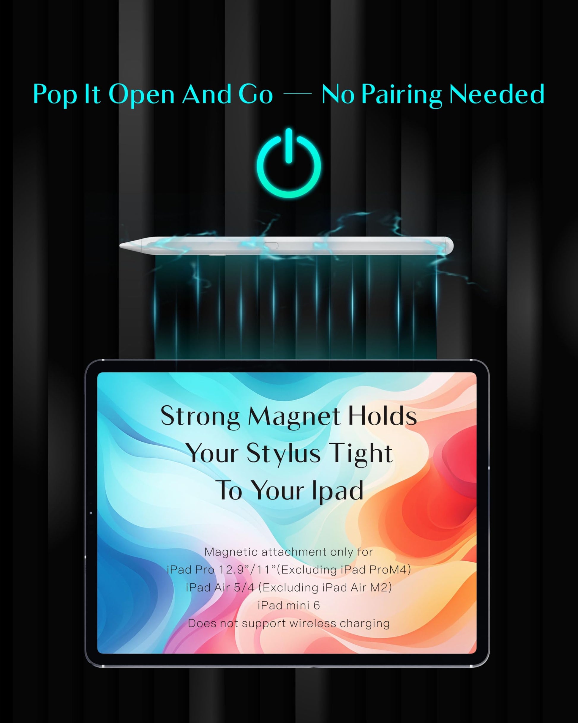 • 【Palm Rejection & Magnetic Design】 Designed to support palm rejection and tilt sensitivity, this iPad stylus pen for iPad 9th/10th generation lets you write and draw naturally without accidental touches. Its magnetic attachment secures the pen to your iPad Pro, Air, or Mini, preventing rolling and ensuring it’s always within reach – a must-have for iPad users.
