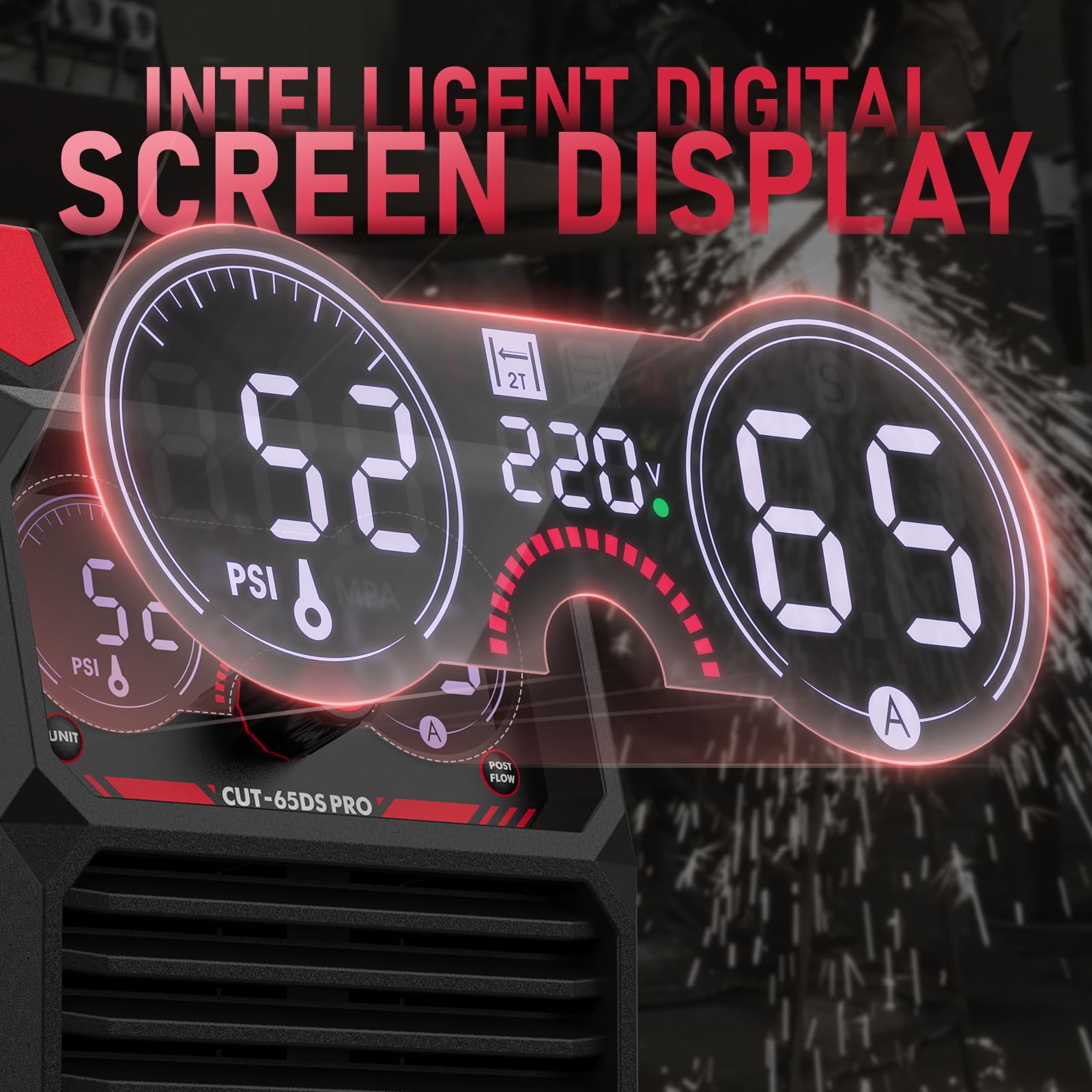 • POWERFUL CUTTING CAPACITY: : Featuring a substantial 65A high current for maximum power, it delivers deeper cutting thickness. Ideal Clean Cut: 5/16'(8mm)@110V, 3/4'(20mm)@220V, Maximum Cut: 1/2'(12mm)@110V, 1'(25mm)@220V. Powered by international leading MCU intelligent digital control technology, it ensures deep, precise, and clean results every time.