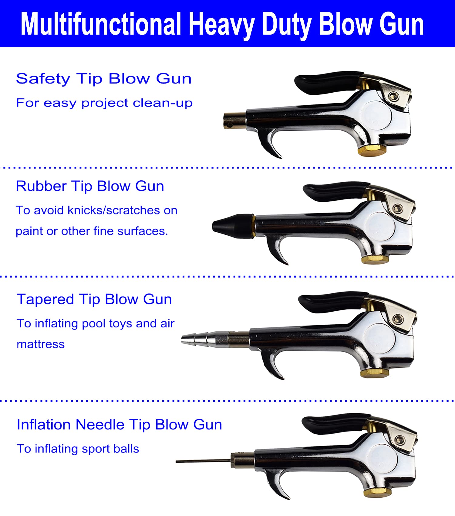 • 6-PIECE STANDARD BLOW GUN AND NOZZLES FOR CLEANING JOBS AND INFLATING POOLS AND SPORT BALLS: Standard Blow gun with (3) inflation nozzles and (2) inflation needles for pool toys, sports balls and air mattresses