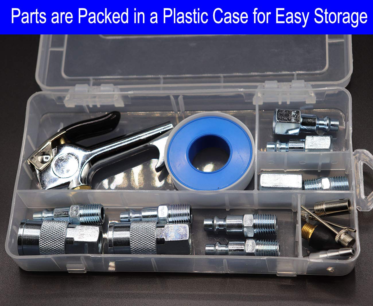 • 11-PIECE HEAVY DUTY 1/4' INDUSTRIAL STEEL AIR HOSE FITTINGS: Quick Couplers and plugs are made of hardened steel plated to resist rust and long time use. Recommended use with thread seal tape(Included)