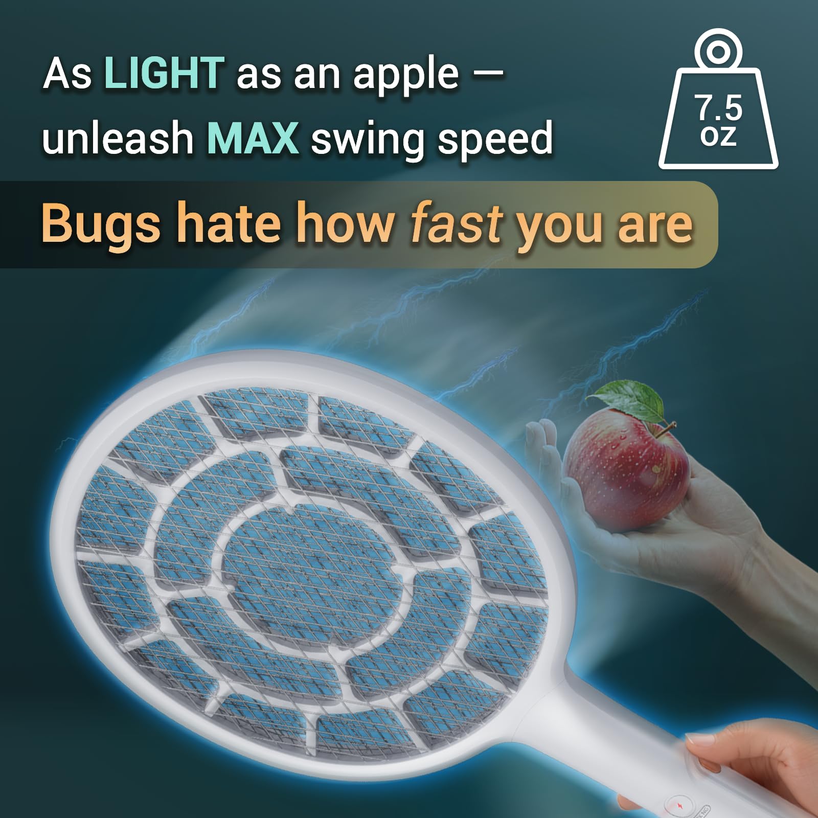 • BUILT FOR THE LONG HAUL – This handheld bug zapper racket doubles as an electric fly swatter racket / fly swatter electric zapper, forged with a 53 % stronger support structure that stays zero warp after 40 000 swings, stays still lethal after 20 000 zaps, and offers 78 % longer power stability for truly long-lasting, enhanced durability.
