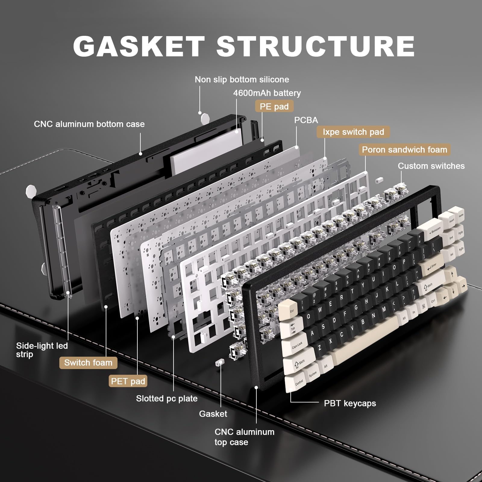 • Hot Swap Gasket Mount Keyboard: Elevte typing experience with AL71, which utilizes a premium gasket material to absorb vibrations and eliminate any noise.The gaming keyboard supports 3-pin and 5-pin mechanical switches.Equipped with poron sandwich foam,poron socket foam,PET sound pads,and PBT keycaps,the solid 65% keyboard provides exceptional pleasant typing feeling,ideal for professionals who demand custom keyboard fun,superb quality,and top comfort.