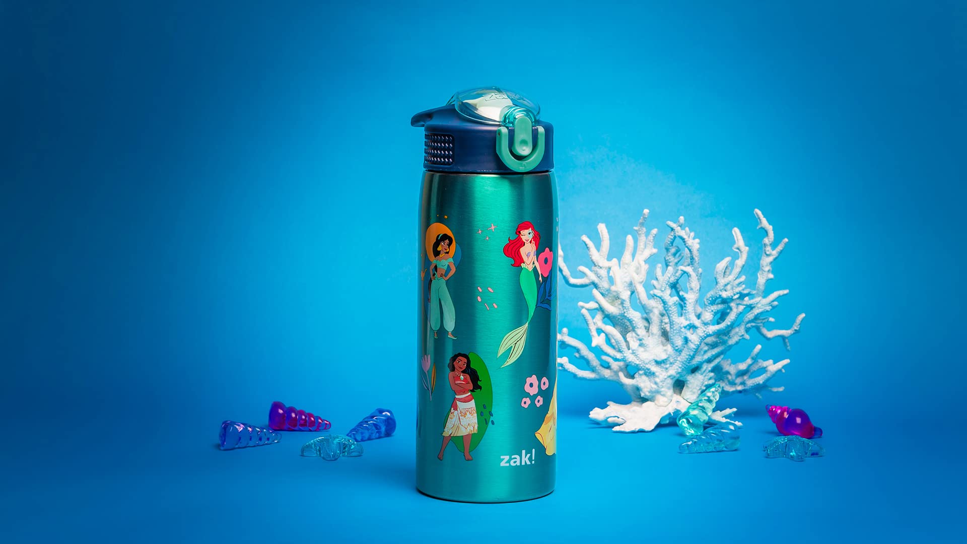 Details: Make hydration easy and fun for Disney Princess fans with a reusable water bottle by Zak Designs! Vacuum Insulation: The drinking bottle has vacuum insulation that keeps drinks cold for up to 20 hours, so your water is always refreshingly chilled. The double-wall construction also prevents condensation from forming on the outer walls, eliminating messy water rings. Reusable and Durable Material: Reusable water bottles will last wash after wash—good news for you and the environment! The 19 oz water bottle is made with food-grade, 18/8 stainless steel, durable enough to use every day and bring on any trip. Leak-Proof Lid: The lid screws on securely and won't leak when the spout is closed, though water flows for easy drinking when the spout is open. The easy-open button has a flip-up lock to keep it from activating accidentally. On the Go: The water bottle has a built-in carrying loop on the lid for easy transportation, and with the spout cover to keep the spout clean and closed, it can be tossed into a bag for worry-free travel. Specifications: 19 oz capacity. Vacuum insulated, stays cold up to 20 hours. Made of durable stainless steel. BPA-Free - Zak is committed to safety. Hand washing recommended, do not microwave. Length: 4.4-inch, Width: 2.83-inch, Height: 8.75-inch. Character: Disney Princess: Ariel (The Little Mermaid), Belle (Beauty and the Beast), Cinderella, Jasmine (Aladdin), Moana, Mulan, Tiana (The Princess and the Frog).