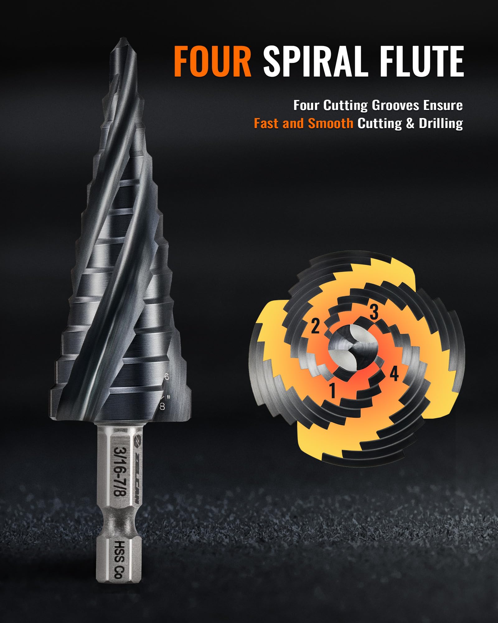 • Smooth & Clean Drilling: Designed with four-spiral flute, out step bit enables faster cutting and drilling compared to dual or single flute bits. It also efficiently clears away chips for smooth performance