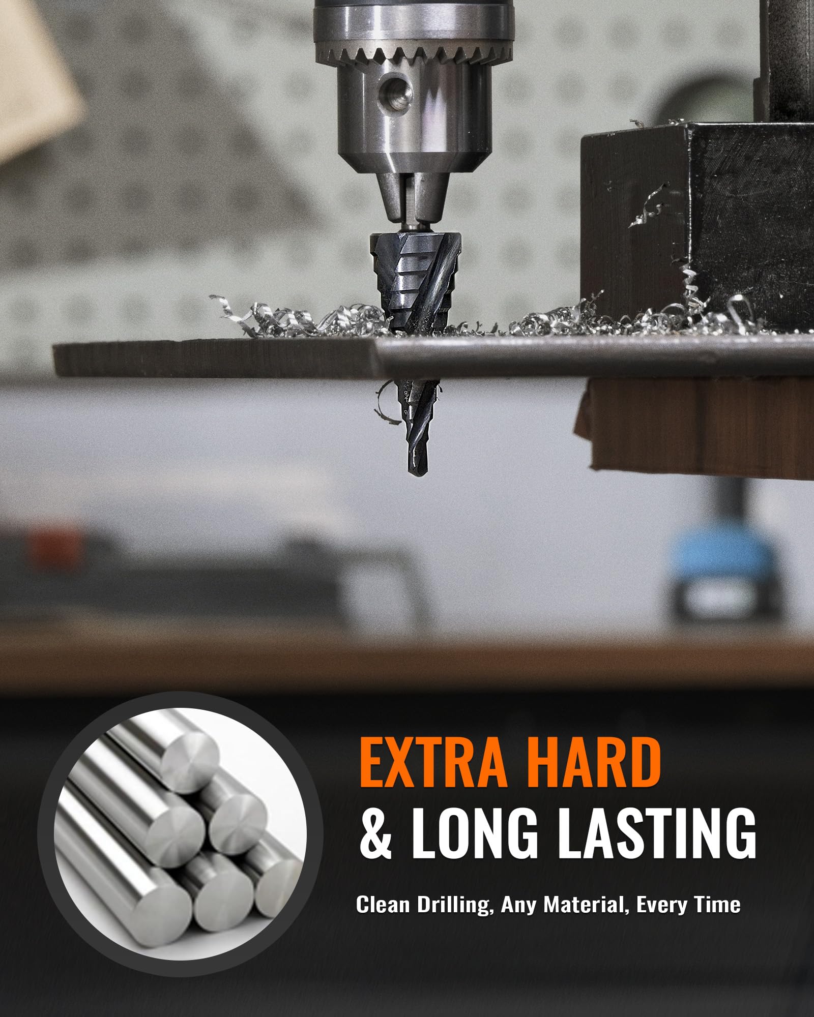 • Titanium-Coated HSS Build: Made of robust high-speed steel with a titanium coating, this step drill bit ensures exceptional strength and lasting endurance to withstand even punishing use