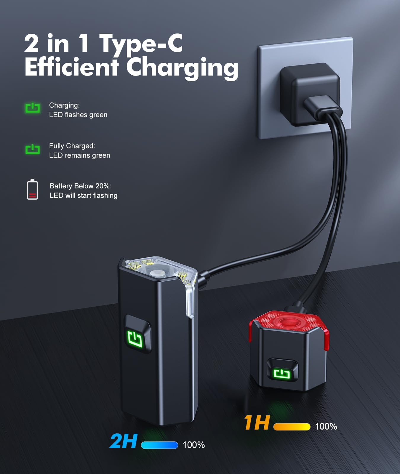 • Efficient Charging, Long Runtime: Quickly recharge this bike light with the provided dual-port Type-C cable, achieving a complete charge within 1-2 hours. Experience prolonged usage with the front light lasting 3-21 hours and the tail light shining for 4-16 hours, ensuring uninterrupted lighting throughout your ride.