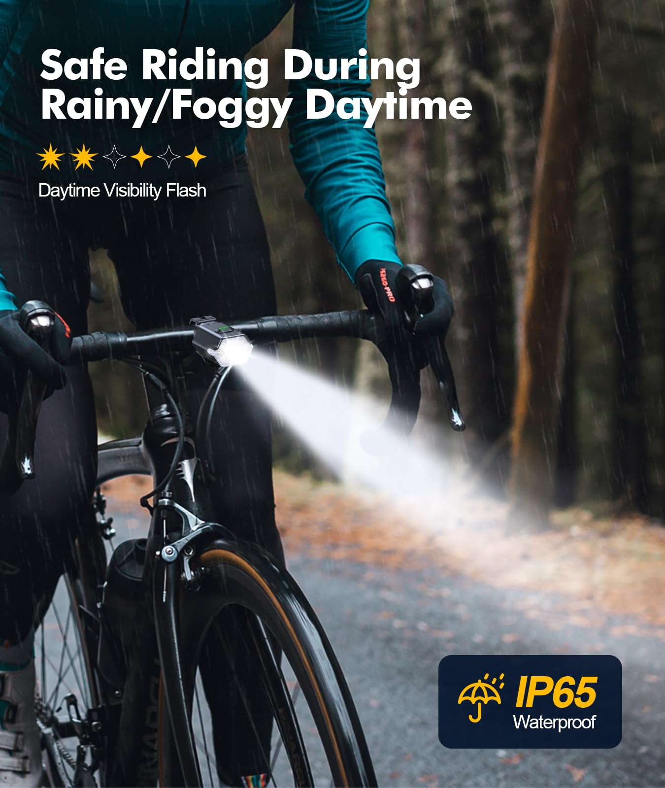 • Versatile Lighting Modes: Just one click on bike lights, and you can choose from 3 front light modes (High-Low-Daytime Flashing) and 6 rear light modes (High-Medium-Slow-Daytime Flashing-Fast Flashing-Slow Flashing), providing various brightness levels and flashing patterns. The daytime flashing mode is designed for safety during daytime rides in foggy days.