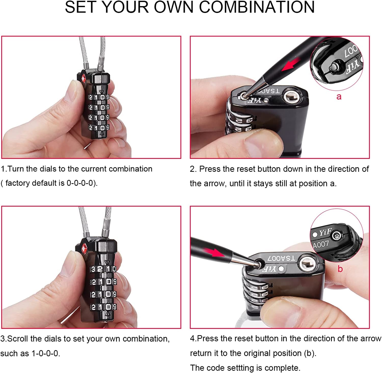 • EASY TO USE: Setting and resetting is super easy with the flip-and-set button at bottom. Instructions are included right at the back of package. High contrast of white big numbers on black wheels bring easy reading. Advanced damper device inside makes each dialing click into place with better accuracy and feeling in code aligning. It is an easy-to-use TSA cable lock suitable both for the young and the old.