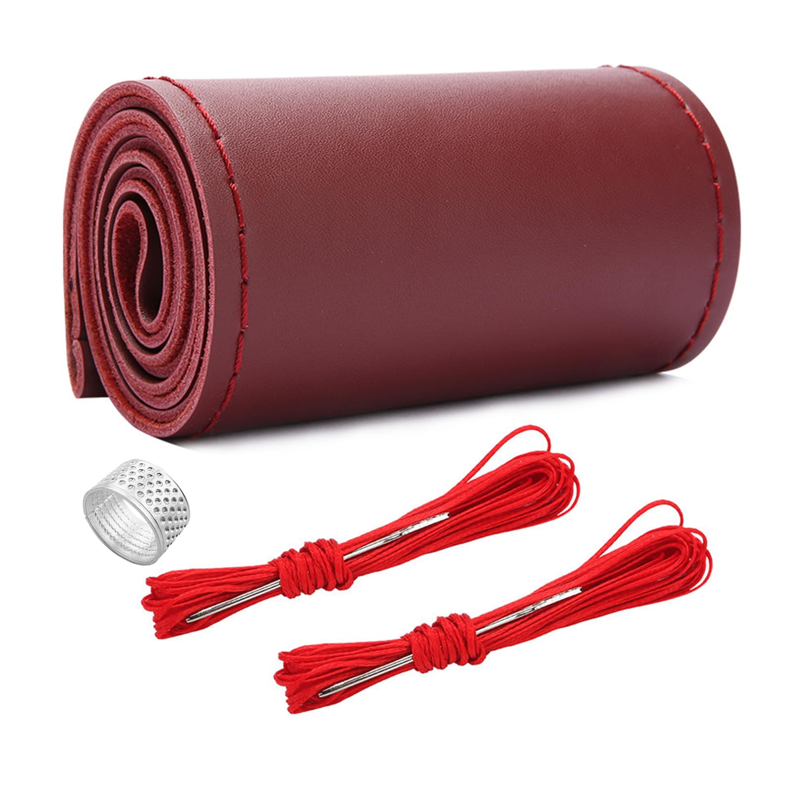 Ziciner Genuine Leather Steering Wheel Cover, Stitch on Wrap, Breathable Anti-Slip Car Steering Wheel Protector for Max Diameter 15 Inch, DIY Sewing with Needle Thread (Wine Red, Glossy)