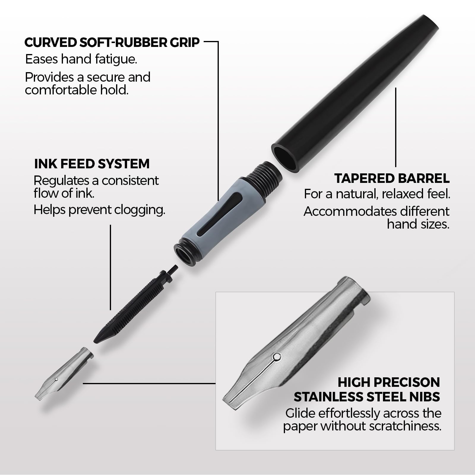 • 3 CALLIGRAPHY NIB SECTIONS - Fine, Medium & Broad nib sizes allow you to write various size lettering and to try new techniques
