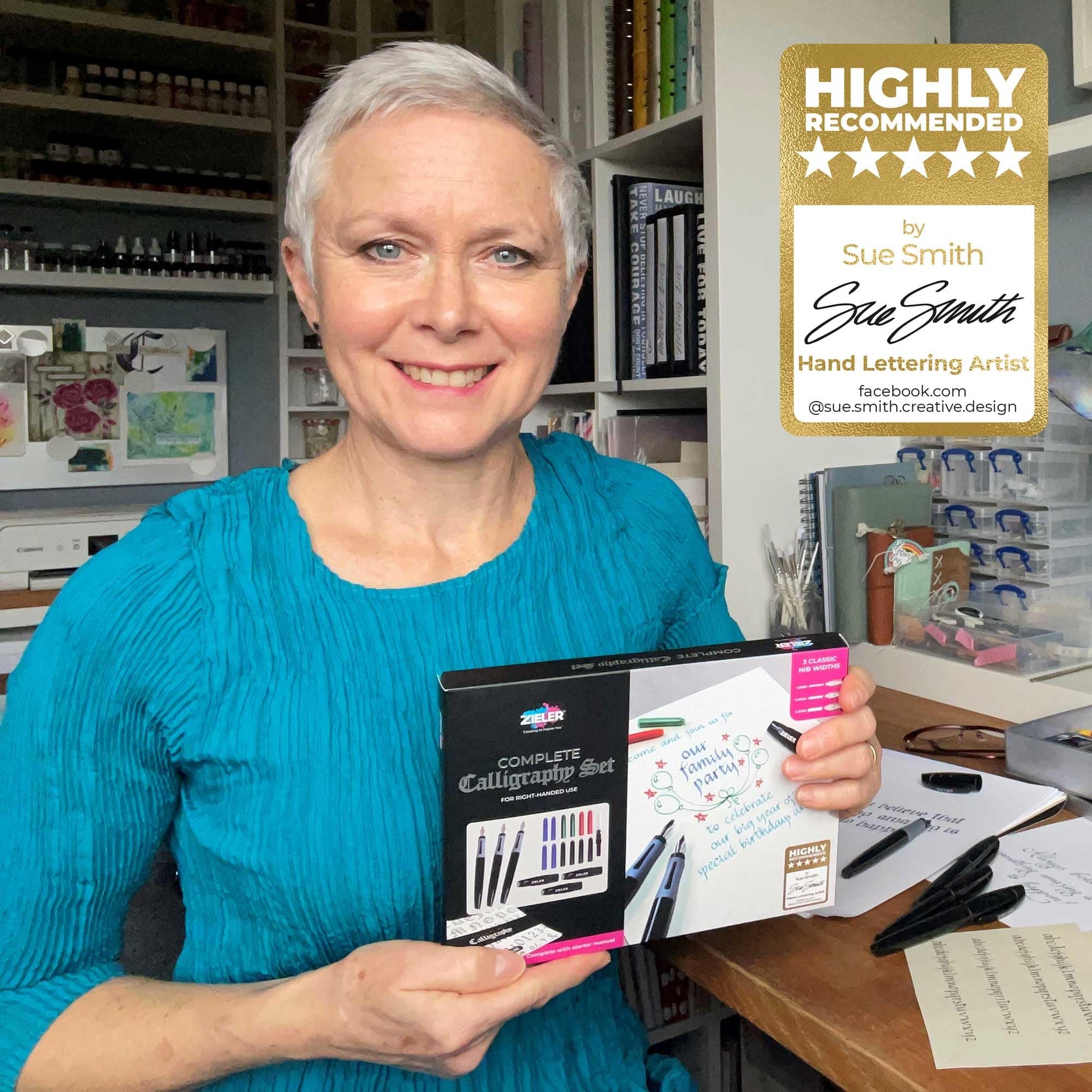 Details: The Zieler Calligraphy 3-Pen Set is complete with 17 pieces and is suitable for all levels. The 3 right-handed fountain pens feature their own cap so that the nibs will not dry out when not in use. The 3 calligraphy nib sections (Fine, Medium & Broad) allow you to write various size lettering and to try new techniques. 12 Calligraphy Ink Cartridges - 4 black, 4 washable blue, 2 red & 2 green are included. These international size cartridges are easily available when it comes to replacing them. Also included is the ink converter which can be used with bottled ink in place of ink cartridges if desired. Simply use the converter to fill ink from your bottle. Ensure you use water-based ink to prevent the pens from clogging up. The step-by-step Guide to Calligraphy Manual helps you enter into the wonderful world of calligraphy and creative lettering!