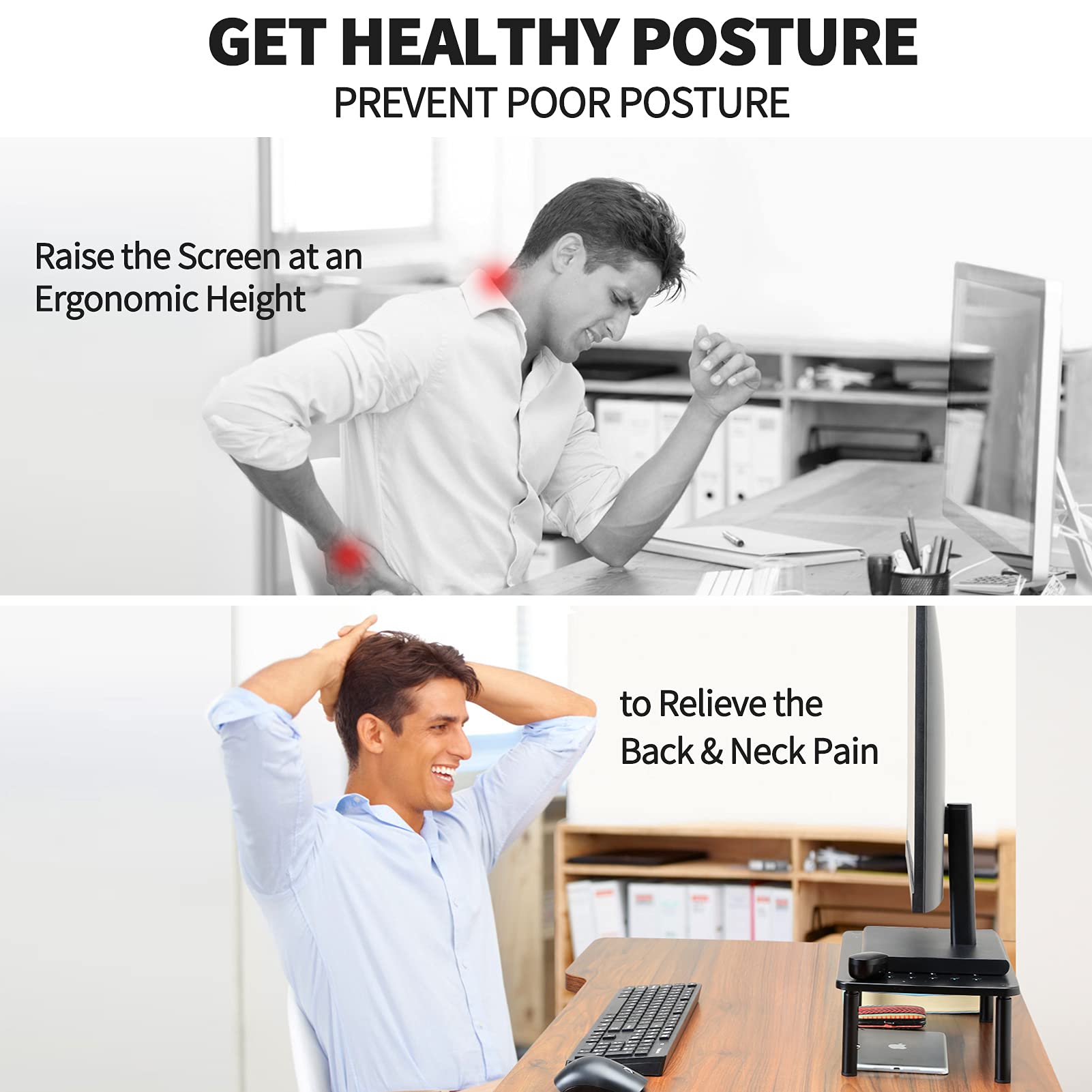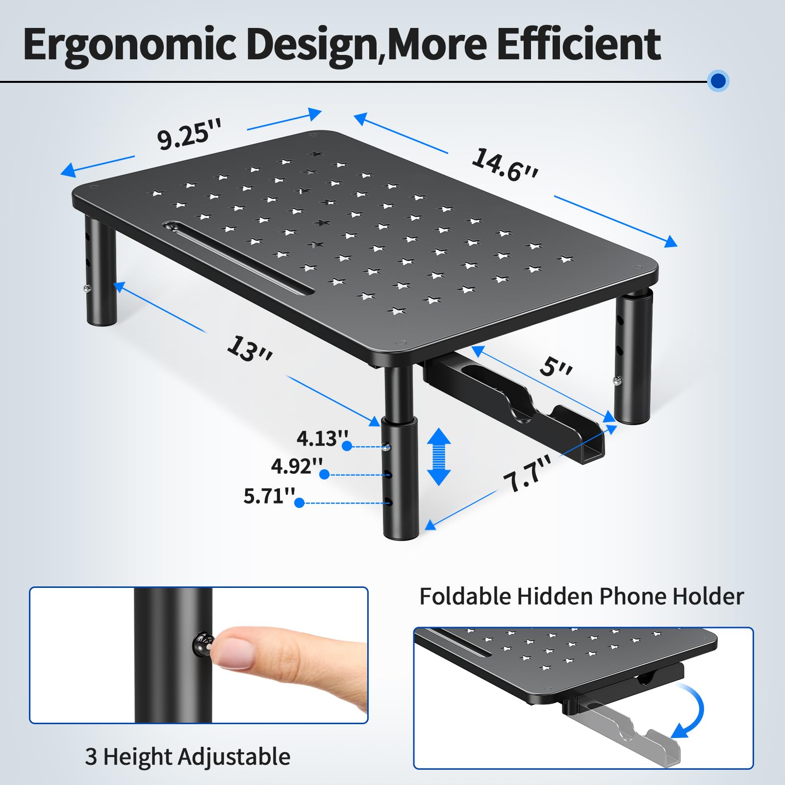• 3 HEIGHT ADJUSTABLE: This ergonomic computer monitor stand with retractable phone holder raises your screen at a comfortable eye-level (4.13”/ 4.92”/ 5.71”). Effectively improves posture to relieve eye-strain, back & neck pain throughout the workdays.