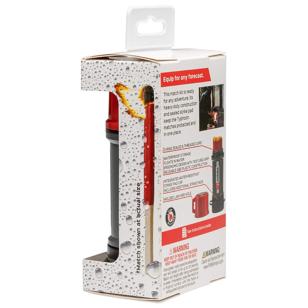 Details: Be equipped for any forecast. This match kit is ready for any adventure. Its heavy-duty construction and sealed strike pad keep the included 15 Typhoon Matches protected and in one place so you can light your fire in even the worst conditions.
