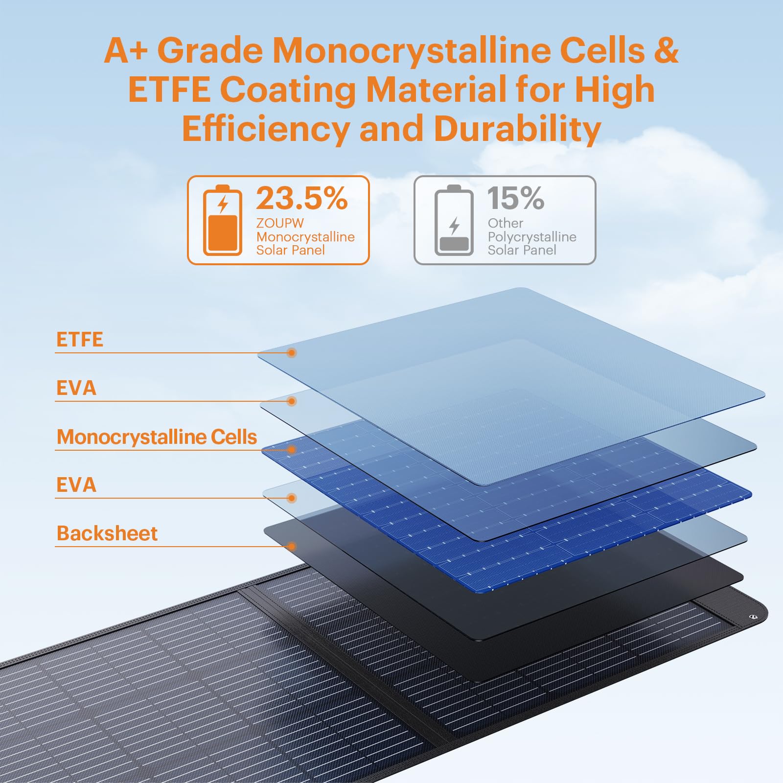 • 【A+ Monocrystalline Solar Cells for 23.5% Conversion Efficiency】ZOUPW 200 watt solar panel utilizes A+ monocrystalline solar cells, achieving an outstanding conversion rate of 23.5%. This 200w solar panel performs well in low-light conditions, surpassing the performance and stability of similarly-rated polycrystalline solar panels.Also this portable solar panel is designed with an auto-optimization feature that automatically reconnects when sunlight returns after a charging interruption.