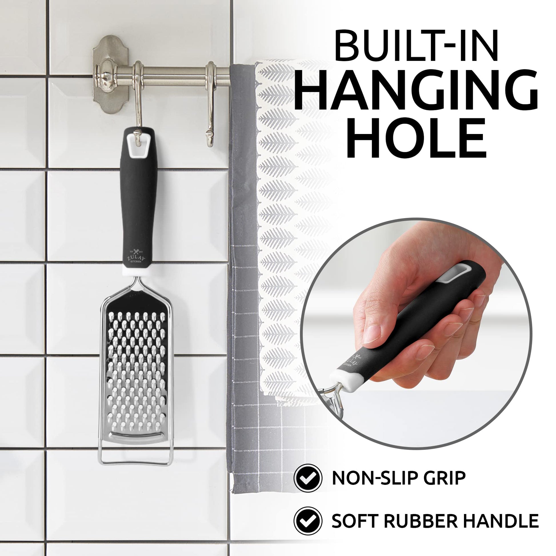 • GRATE WITH EASE & SAVE TIME: Our parmesan cheese grater is made with razor-sharp etched stainless steel blades for enjoying finely grated cheese effortlessly. Sprinkle some flavor over a salad, pizza, pasta, a bowl of soup or use it as a citrus zester for adding a tangy twist to your recipes.