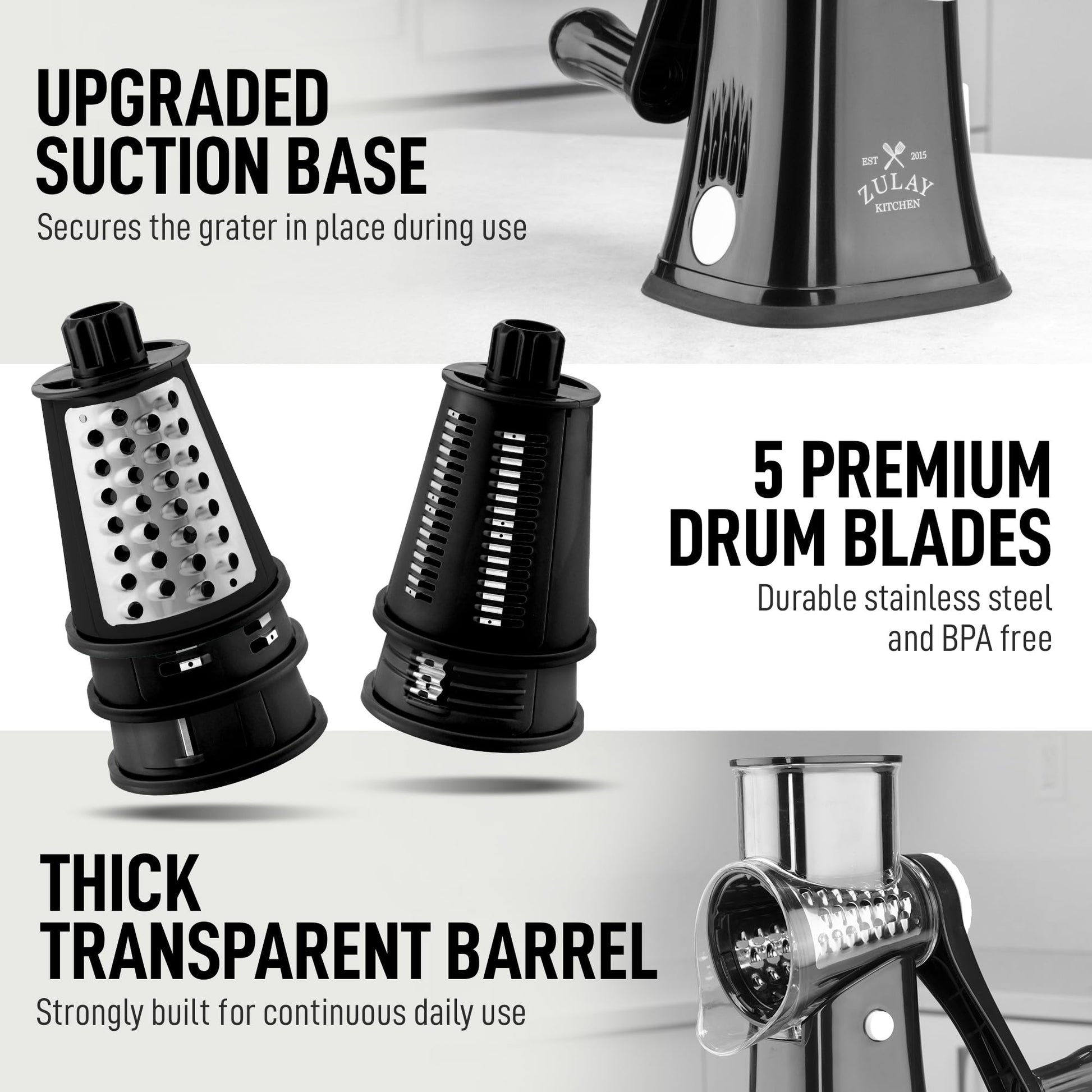 Zulay Kitchen Rotary Cheese Grater 5 Blade Cheese Shredder - Manual Hand Crank Cheese Grater With Reinforced Suction & 5 Interchangeable Drums - Easy to Use, Vegetable Chopper Round Mandoline Slicer