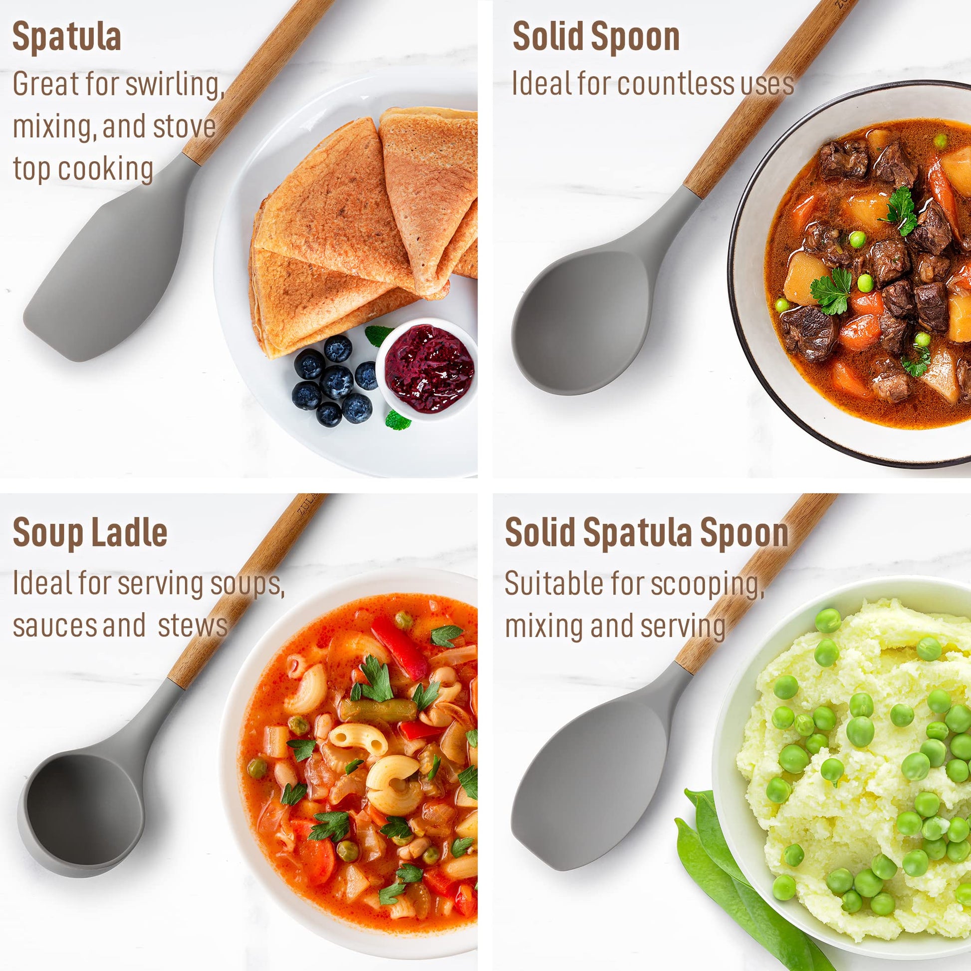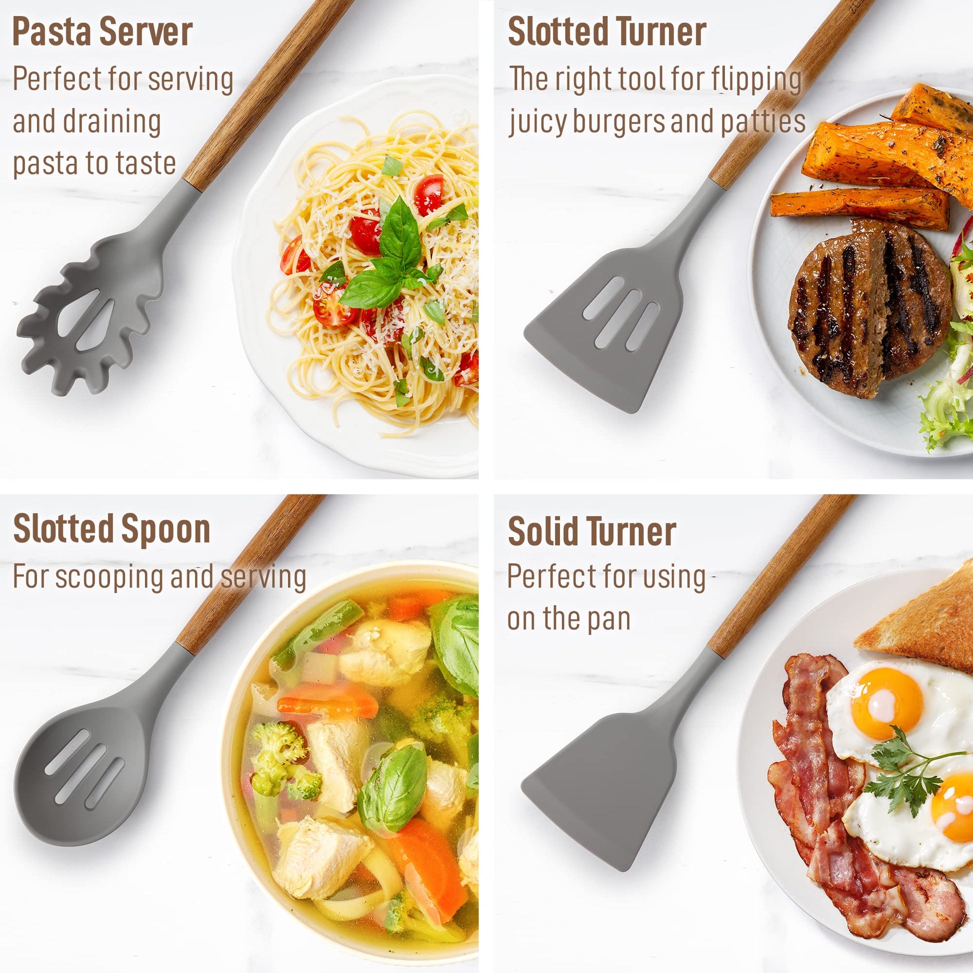 • Perfect For Your Non-stick Pots And Pans: Protect your precious cookware by using these silicone cooking utensil set designed with soft, non-scratch silicone to prevent scratching pots and pans when cooking. Engineered for the right mix between the flexibility of silicone and the stability of wood, making it sturdy, functional, and comfortable to use. Includes a solid spoon, slotted spoon, slotted spatula, solid spatula spoon, solid spatula, solid turner, pasta server, and ladle.