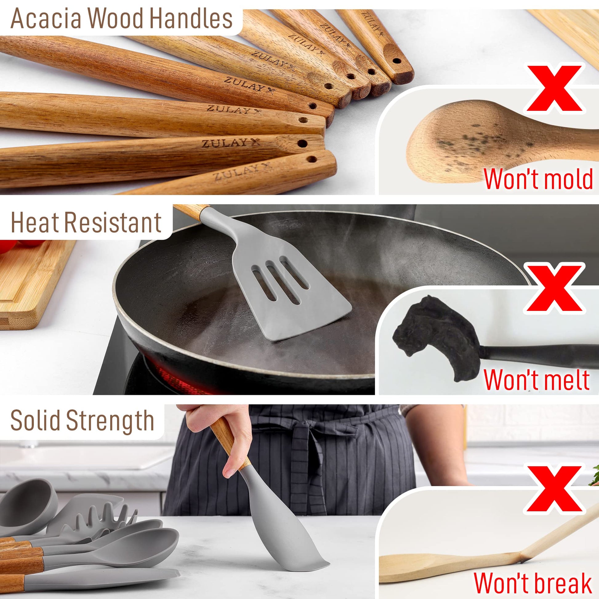 • No Hassle, Zulay Guarantee: We love and take pride in our Wood and Silicone Utensils - 8 Pieces and we back this up with a lifetime guarantee. Have the confidence that this product will last, if there are ever any issues, just contact us and we will make it right. Order now and be assured that this product will live up to your expectations, guaranteed. If it does not, we got you covered. Chances are, you will never need to reach out!